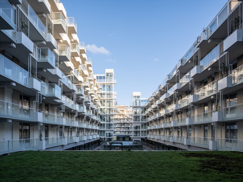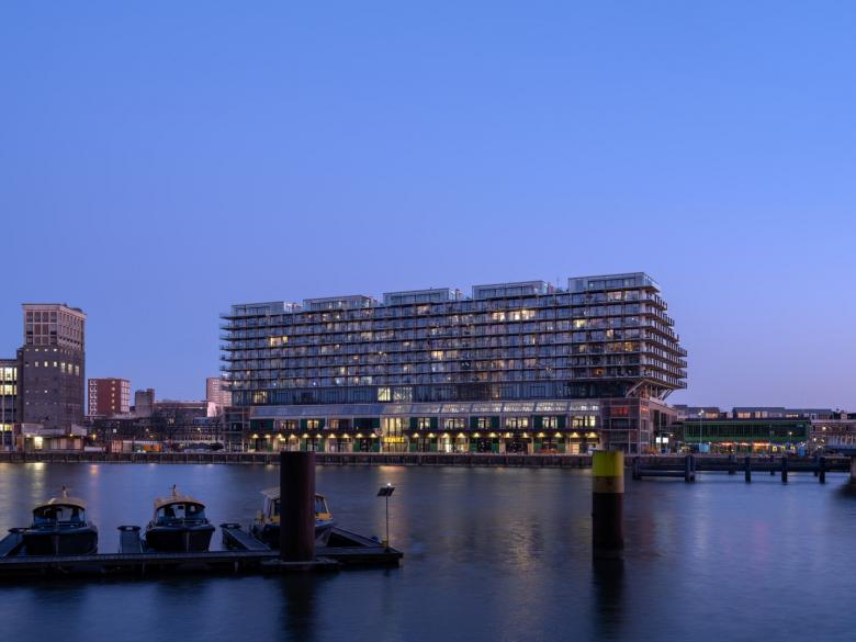 An in-between layer consisting of a gigantic spaceframe structure separates the existing warehouse and new volume above. This middle layer can accommodate either residential or office space. The open portion in this layer offers a magnificent view of the Rijnhaven and the Wilhelminapier. Each loft contains a 2.5-metre-deep outdoor space that extends the full width of the apartment.