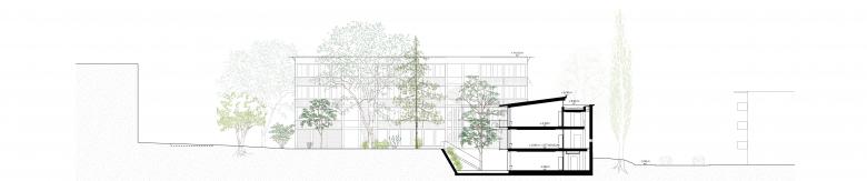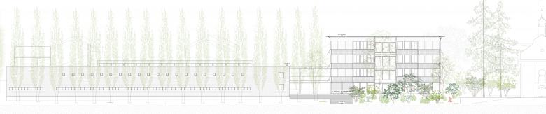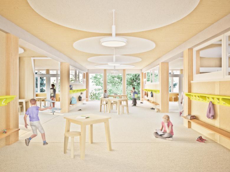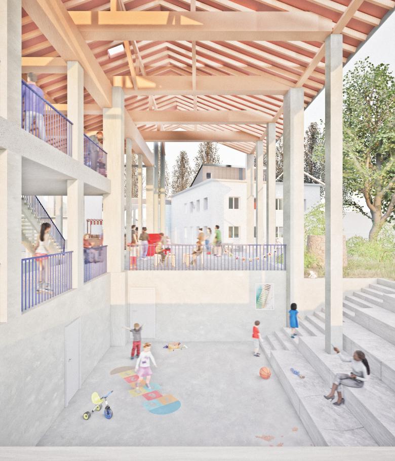 Das Projekt ASSEMBLE ergänzt das bestehende Schulareal mit einem kompakten, viergeschossigen Neubau, der respektvoll zwischen der Mariawil Kapelle und dem schützenswerten Schulhaus von Schnebli, Ammann, Ruchat positioniert wird. Die Setzung bewahrt den wertvollen Baumbestand, stärkt natürliche Kaltluftachsen und schafft identitätsstiftende Freiräume für Schule und Quartier. Das alte Schulhaus wird zum offenen Quartierpavillon transformiert und schafft gedeckte Räume für gemeinschaftliche Nutzung. Der Neubau ist klar strukturiert, dennoch flexibel und ermöglicht diverse Unterrichtsformen durch offene Lernlandschaften. Die Aussenerschliessung bildet mit der gedeckten Verbindung eine Einheit. Ausgestellte Solarbänder und Stoffstoren verleihen den Fassaden eine Tiefenwirkung. Im Vordergrund stehen die Prinzipien der Kreislaufwirtschaft. Materialien aus dem Rückbau werden wiederverwendet und die Konstruktion ist als Holzbau im Sinne von „Design for Disassembly“ konzipiert. Somit bietet das Projekt ökologischen sowie sozialen Mehrwert.