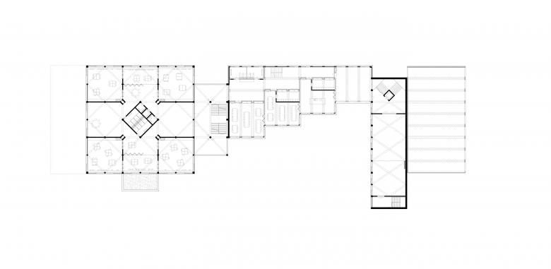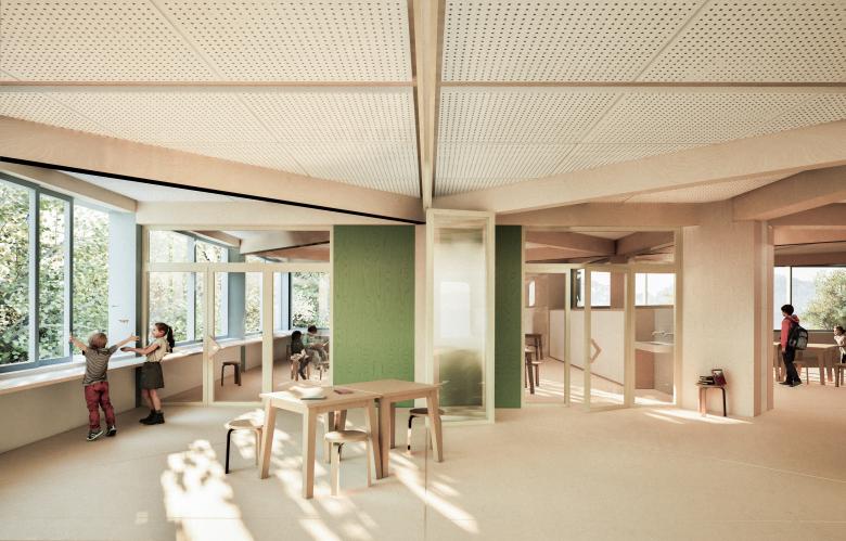 Das Gebäudeensemble der Schulanlage Meierhof wird als Wettbewerbsvorschlag westlich ergänzt durch einen offenen Erschliessungstrakt und einen kompakten Neubau. Die Volumetrie nimmt die charakteristische Staffelung des Bestandes auf, und führt die horizontale Bänderung in der Fassade fort für ein einheitliches Erscheinungsbild. Östlich wird der Bestand mit einem Aulatrakt ergänzt, welcher direkt an die Turnhalle anschliesst. Dieser Eingriff wertet den Pausenplatz auf und gibt Quartiernutzungen Präsenz und Identifikation. Das dreigeschossige neue Schulhaus überzeugt mit seinem offenen Raumkonzept mit flexiblen Lernbereichen, welche Eigenständigkeit und Austausch fördern. Die statische Struktur mit den charakteristischen Doppelstützen und einem Achsraster von 3 Metern verbindet Alt und Neu. Durch das Abdrehen des orthogonalen Systems erzeugen wir eine eigene Identität mit einer sinnlichen Anmutung. Eine ressourcenschonende Bauweise mit Holz und Lehm, und eine Low-Tech-Lüftung senken den Energieverbrauch und schaffen eine zukunftsfähige Lernumgebung.