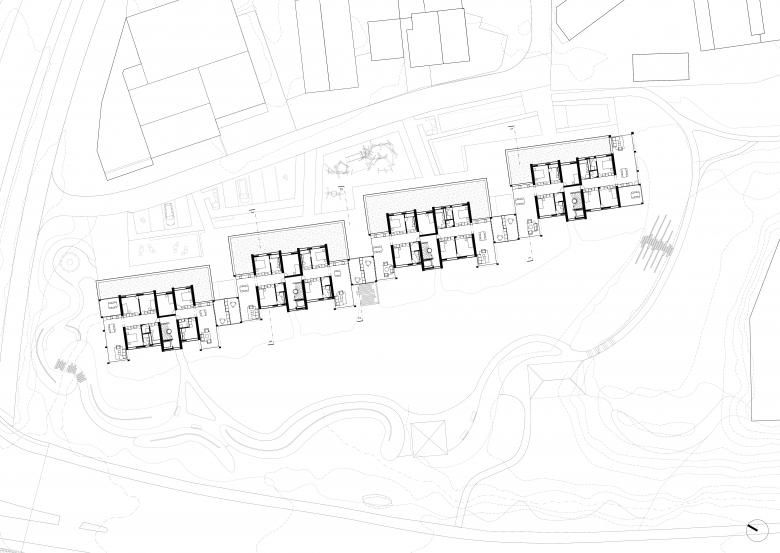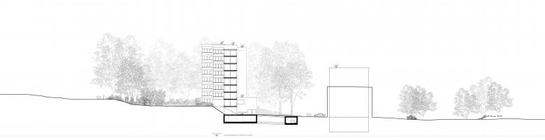 Als Studienauftrag entsteht eine geplante Wohnüberbauung in einer ehemaligen Kiesgrube und bildet trotz stark frequentierten Verkehrswegen eine grüne Oase mit Weiher und Baumkranz. Der gestaffelte Baukörper folgt der Topografie und verbindet Zugang und Parkebene über eine Freitreppe. Offen gegliedert mit Loggien wirkt die Anlage als Ensemble von vier Gebäuden. Vorgartenflächen mit Spiel- und Aufenthaltsbereichen fördern die soziale Qualität im Quartier. Der rückwärtige Park mit Pavillon und Rundweg wird zum gemeinschaftlichen Zentrum. Loftwohnungen im Parkgeschoss sowie flexible Schaltzimmer ermöglichen eine grosse Wohnvielfalt. Die durchgesteckten Wohnungen profitieren von Sonne auf beiden Seiten, ruhiger Lage und Blick ins Grüne. Durch vertikale und horizontale Gliederung sowie unterschiedliche Materialien erhält das Gebäude eine klare Tektonik und angenehme Massstäblichkeit. Holzbauweise, Lehmspeicherwände und Lärmschutzmassnahmen sichern ein gesundes Raumklima und hohe Aufenthaltsqualität.