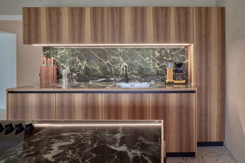 60 Jahre später erfuhr das Wohnzimmer eines schlichten Tiroler Landhauses mit Baujahr 1962 eine Rundum-Verwandlung: über dem Kopf der Sichtdachstuhl, vor den Augen großzügige Glasflächen nach Süden und Westen – so gestaltet sich die Bühne für die offene Küche mit Essplatz, den neuen zentralen Akteur des Hauses. Für den Bauherren und Architekten lag es als leidenschaftlichem Koch nahe, den Fokus auf den freistehenden Küchenblock mit integriertem Herd zulegen. Ebenso wie die Küchenzeile wurde der Monolith in Handarbeit vom Tischlergefertigt. Das Ergebnis fügt sich in seiner Anmutung zeitlos in das bestehende Ensemble ein und wird durch einen zum Esstisch umfunktionierten Besprechungstisch mit aufgearbeiteten Vintage-Stühlen ergänzt. Perfekt unperfekt und dennoch absolut stimmig: die eigens angefertigten Terrazzofliesen sowie der sandfarbene Lehmputz.