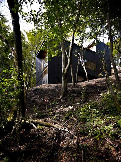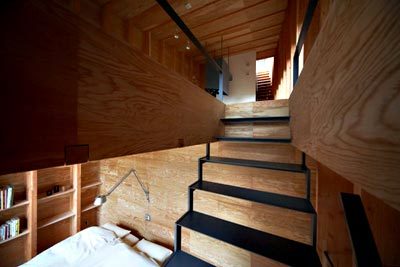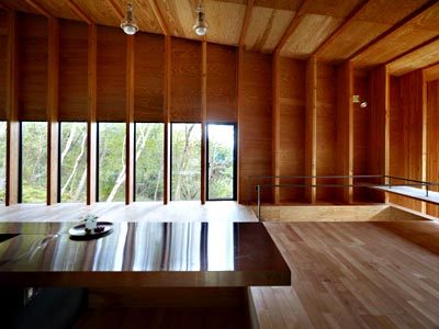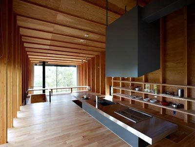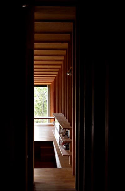 Inside the house, the rooms are defined by a series of posts that extend up the walls and across the ceiling to form a boxy framework that is an abstraction of the forest itself. At the same time, the three-dimensional sensation created by the receeding forms actively orients residents within the space.