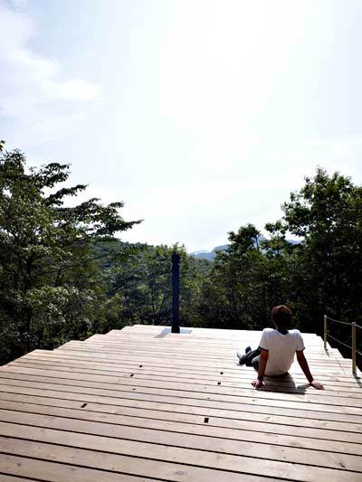 As visitors look out the windows, their gaze gradually falls from the crown of the trees down to their base, and soon enough, they will feel the outside world is within palm of their hand. Standing before the window, our impression of the exterior is at once weak and strong: We both face the mountain courageously and are swallowed up by it.
