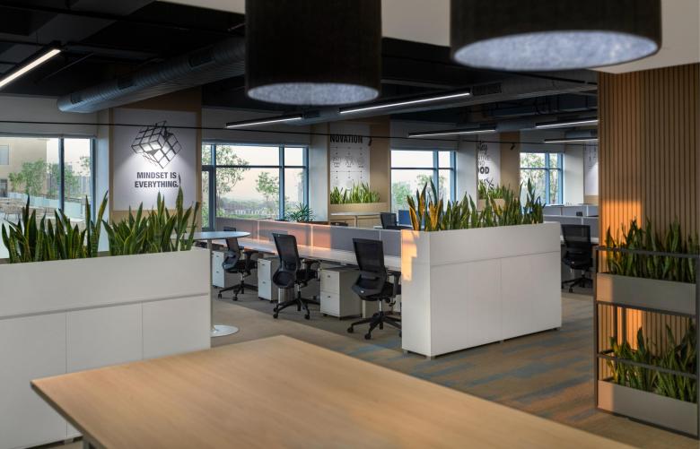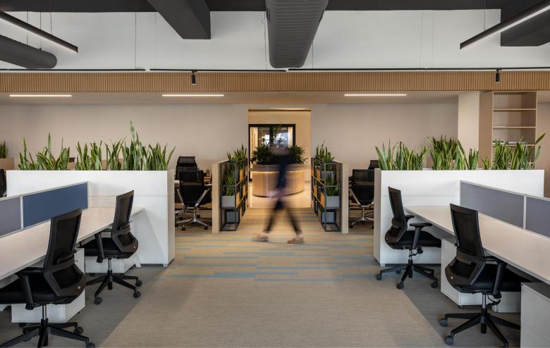 A pivotal focus in the design process was ensuring employee wellness. To support this, spaces have been planned to inspire health and productivity, providing ample natural daylight and circulation. The transition space between reception and workstations was transformed into a 'Zen space,' featuring indoor plants and a calming feature wall. Primary workstations align along the building's perimeter, while carefully positioned work desks prevent glare in the main workspace. An outdoor terrace serves as a versatile working space, breakout, and events area for employees.