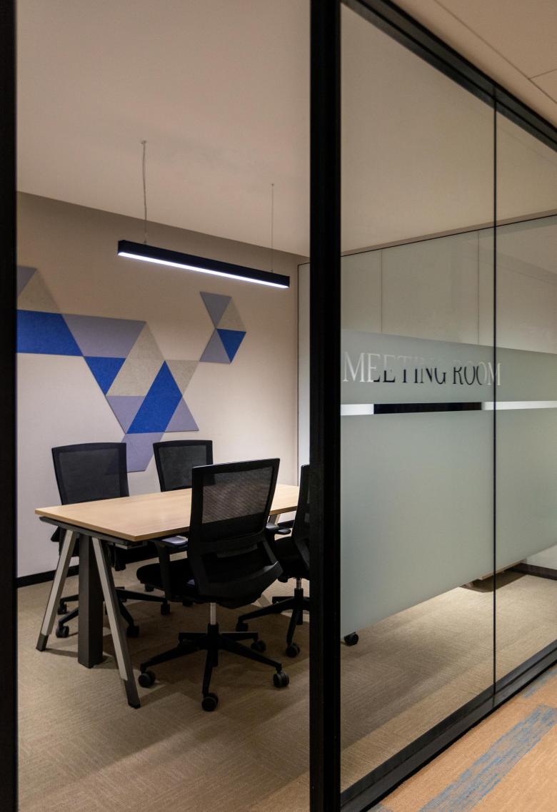 working areas enjoy natural light, augmented by daylight sensors in the main workspace. Occupancy sensors optimize energy consumption in enclosed areas, resulting in nearly 50% less energy usage compared to conventional workspaces. The office further embraces energy-efficient LED lighting, motion sensors, and water-conserving plumbing fixtures.