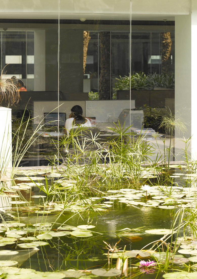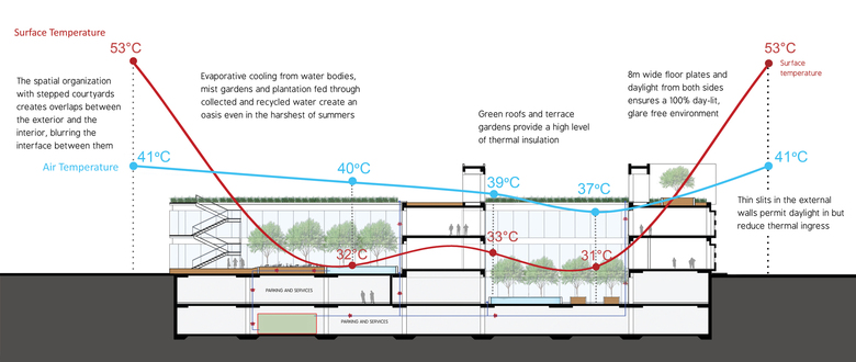 Energy Consciousness dictates the internal spatial and programmatic composition through a series of open and semi-open spaces. Instead of an overlay of an environmental layer, Passive design techniques are employed throughout the scheme and takes into consideration the importance and relevance of energy conscious design within the modern work culture. Solar exclusion is achieved by means of a solid external perimeter, which only permits diffused daylight into the office environs. The reliance on artificial Lighting is substantially reduced as courtyards are created to increase natural light levels on the floor plates. The courtyards help to keep the solar ingress out and control the temperatures of a multitude of spaces throughout the building while also allowing for sufficient day lighting into the workspaces. External Spaces are tempered using courtyards and terrace gardens that facilitate thermal insulation. Shaded Outer façade with air cavity construction, very small slit windows on the outside, courtyards with microclimate controls (shading and mist gardens, water bodies and plantations) all aid in reducing the solar ingress. Green Roofs and terrace gardens also provide a high level of thermal insulation. Water bodies aid in evaporative cooling thereby reducing dependence on artificial means of cooling and also create a microcosm of the civic environment rich with the potential for social transactions.