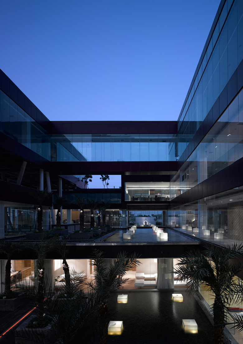 As is the nature of most custom designed corporate developments, the building had to exemplify the identity and corporate ideology of equity and transparency in the workplace as an integral part of the architectural vocabulary. Conceived as a solid perimeter scheme with a more fluid interior, the morphology blurs the interface between the inside and outside. The site surroundings and context along with an optimum enclosed square volume enabled a built form with minimum exposed surface area. The built form configured of 8m wide office bays optimizes the natural day lighting and helps to define the programmatic requirements of the office. A stacking system is used to generate a variety of open spaces; courtyards, verandahs, terraces, green roofs etc. that help to structure the office spaces. A central spine traversing the built volume serves as the common activity zone, with other departments branching out. The design’s conceptual strength comes from the spatial organization which creates overlaps between the exterior and the interior and between the various programmatic requirements, hence creating a vibrant and creative work environment.