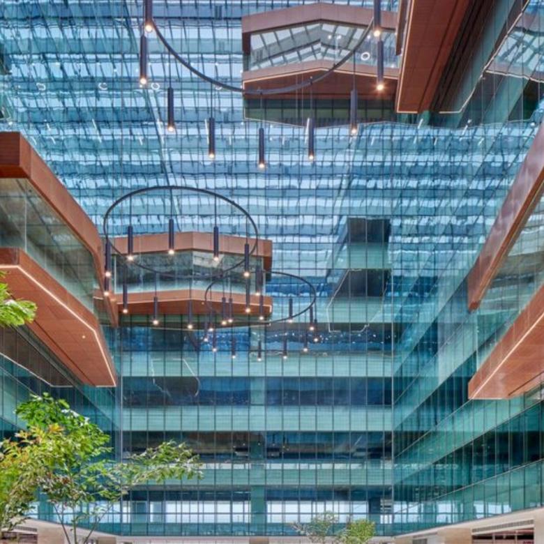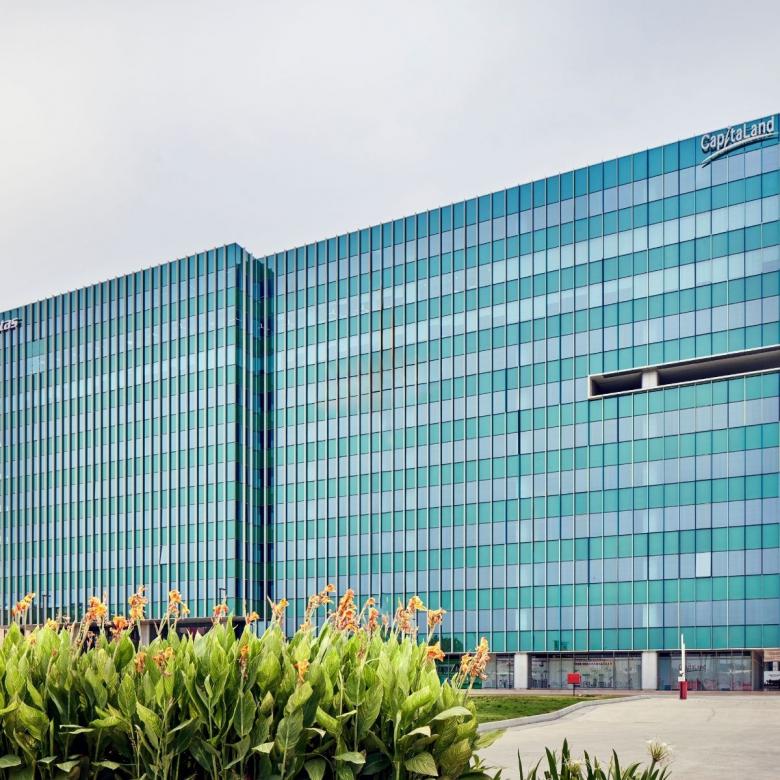 Each tower rises to a height of 45 m, comprising three basement levels for parking, a ground level for retail and food courts, and ten storeys above for office leases, capped by a terrace programmed for wellness activities. A naturally lit central atrium featuring hydroponic vertical gardens enhances indoor air quality and offers visual relief to each level. A high-performance glazed façade wraps the towers in laminated glass fins whose tonal variations echo CapitaLand’s brand palette. Landscaped refuge balconies and projected masses add a dynamic quality to the facade by offsetting the linearity of the tower.