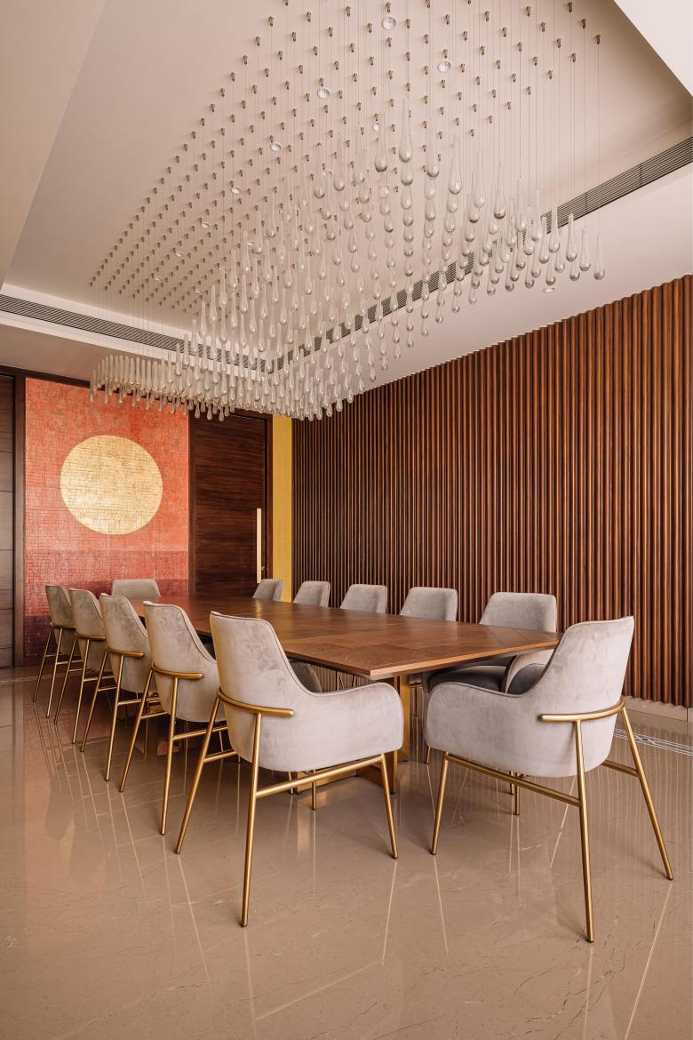 All spaces are designed in compliance with the science of Vaastu. The home is planned axially with three courtyards across different levels, and this interplay of stepped levels has been derived from the design of regional baolis or step-wells. A welcoming double-height atrium gives way to a double-height communal courtyard with a Kalpataru tree–the central element along the north-south axis on the ground floor. This axis visually connects the approach mound and drop- off area to the indoor and alfresco dining areas. Beyond the atrium, a crisscross tile pattern, an expression of the regional bandhani textile, demarcates an area to establish a sense of pause. The essence of the house is captured in this spot by a suspended kite installation inspired by Gujarat's kite flying traditions and a louvred skylight that pulls daylight into the home. The skylight is integrated with a butterfly roof, enabling stack effect to naturally cool the interiors. The pooja area exudes a spiritual undertone, with a serene water body adjoining the courtyard and representing its close connection to nature. Along with being the social heart of the home, the well-lit courtyard is also designed to serve as a space to display sculptures and other artworks, as the family plans on developing an art collection over the years. Provisions are made for the artworks to be suspended, becoming an intrinsic part of the space.
