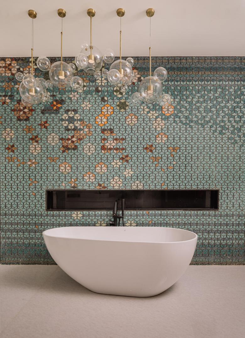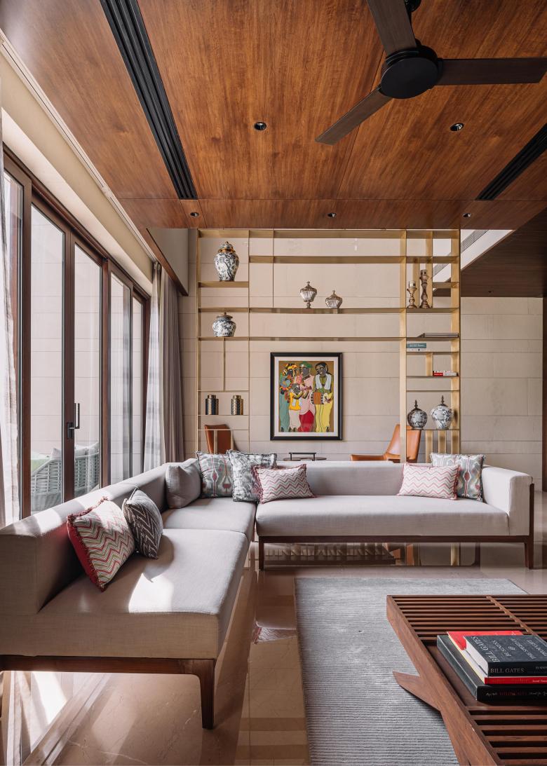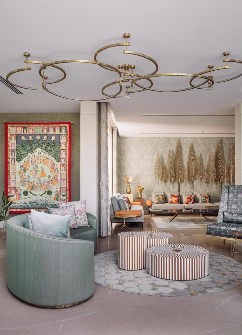 The design scheme for the interiors revolves around the five elements of nature: fire, water, air, earth, and flora. Leaf-patterned screens and sheer curtains and columns cladded with fluted wood emulate the spirit of a forest. Warm neutrals and earth tones characterise the master bedroom, whereas delicate, airy pinks and whites inspire the daughter’s bedroom. The feature walls and material palette in the kitchen are centred around fire, while a water body encompasses the pooja room. A combination of patterned and plain wooden flooring and beige stone flooring further inject warmth into the interiors. Cultural elements like jhulas dot intimate corners yielding an unmistakably Indian character to the spaces to create a sense of home.