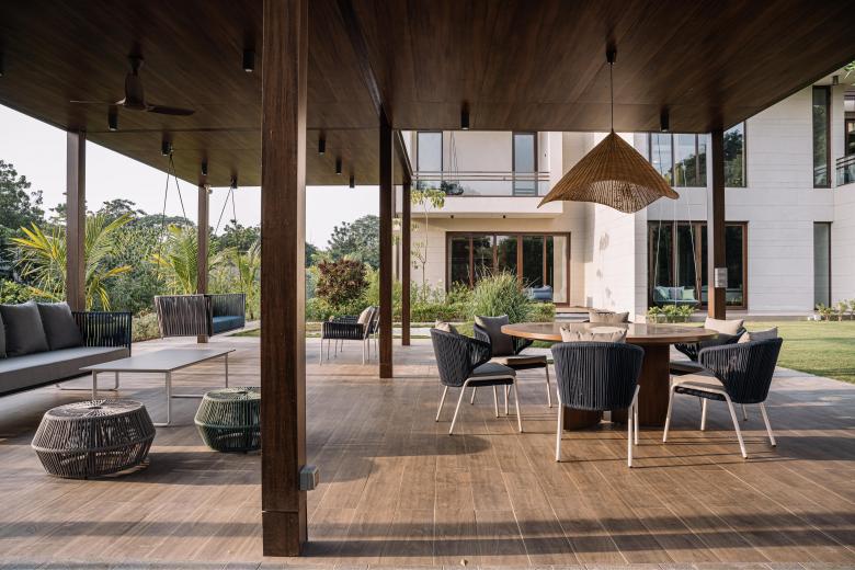 The clients, owners of a leading tea conglomerate, wanted a home that has an iconic presence and blends with nature. Located on a one-acre plot, the home is surrounded by a verdant landscape of Gulmohar, ficus, Rudraksha and Bakul trees. It draws inspiration from Gujarat's culture and architectural vocabulary to express the family's values, outlook, and way of life.