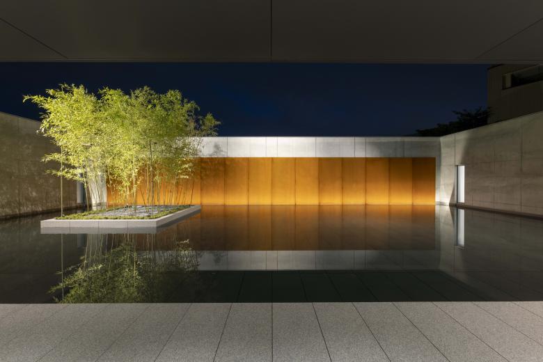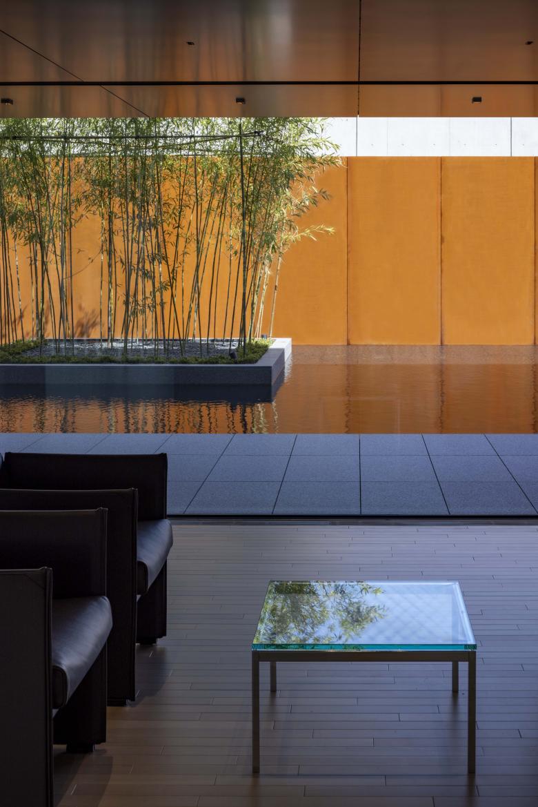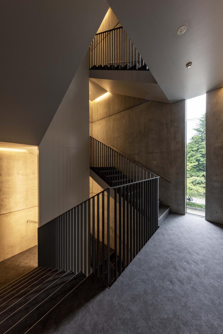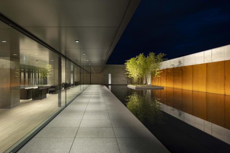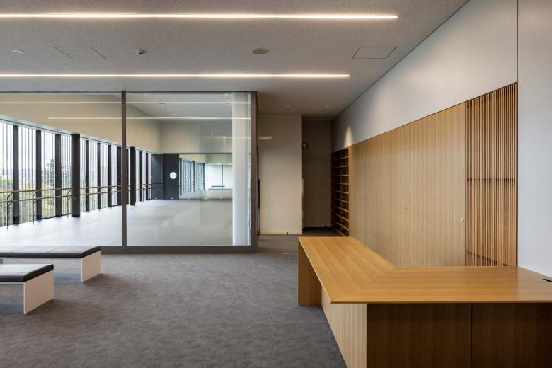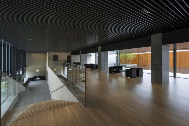 Entering the corridor from the approach, a staircase leads to the second floor. Ascending the stairs, the second-floor lounge offers a panoramic view of "Takaoka Kojo Park" through the aluminium louvers, framed by the corridor's atrium. Simultaneously, shifting one's gaze eastward reveals the continuous expanse extending towards the water garden and the eastern sky. This is a place where one can spend tranquil moments contemplating the water garden's seasonal scenery: the shimmering ripples against a backdrop of rusted iron, bamboo fronds swaying in the breeze, or its winter snow-covered beauty.