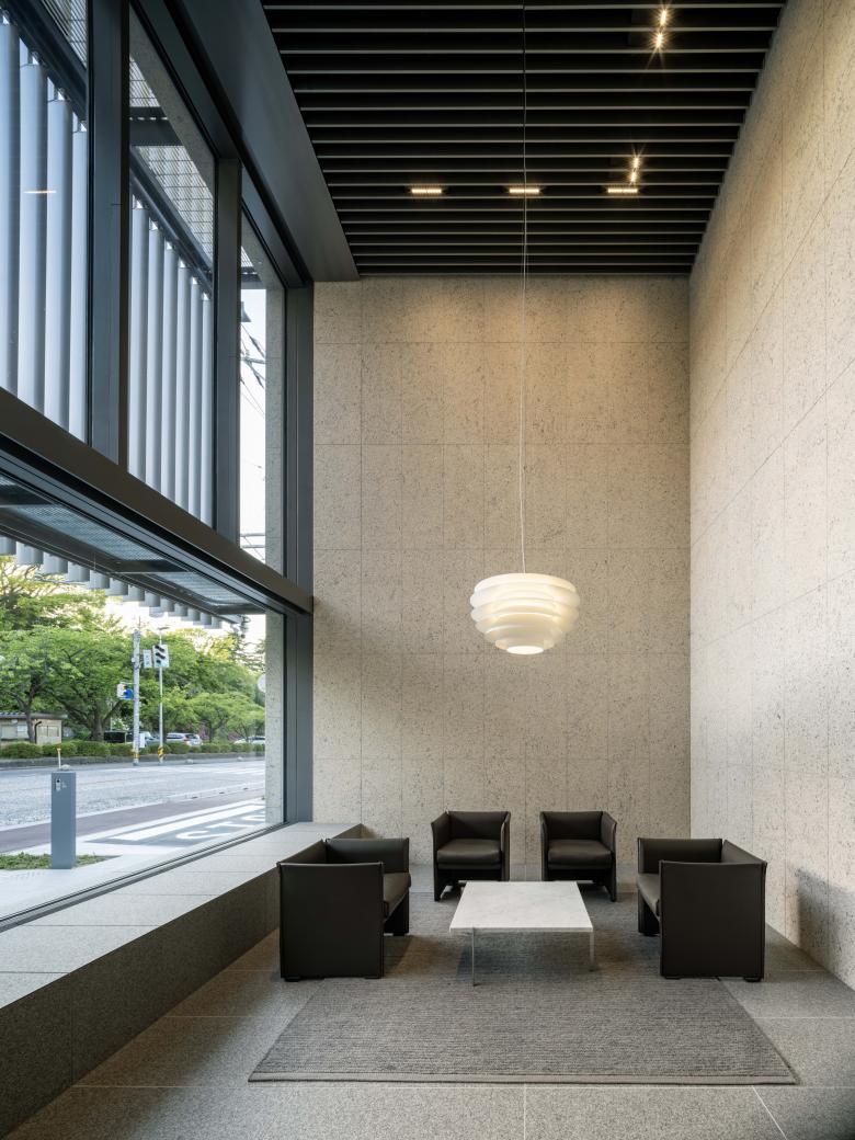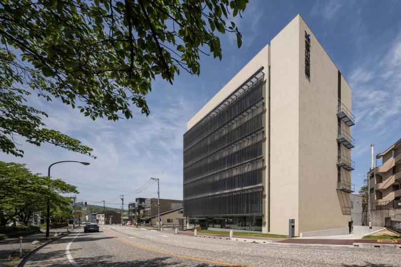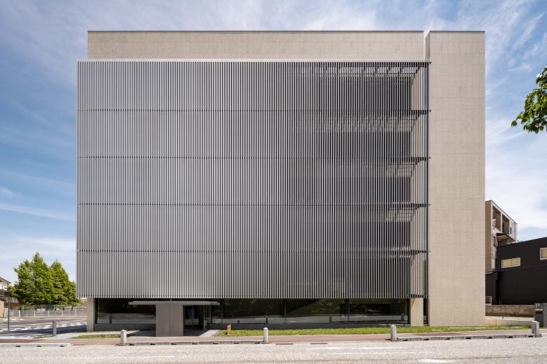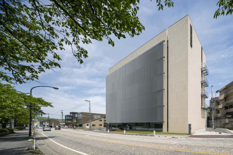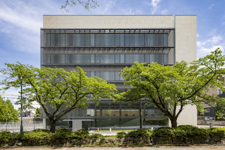 The façade is composed of walls clad in stone of a warm, approachable colour palette and movable aluminium louvers evoking Takaoka's traditional Senbon-koushi latticework streetscape, harmonising with the rich, seasonal transformations of "Takaoka Kojo Park".