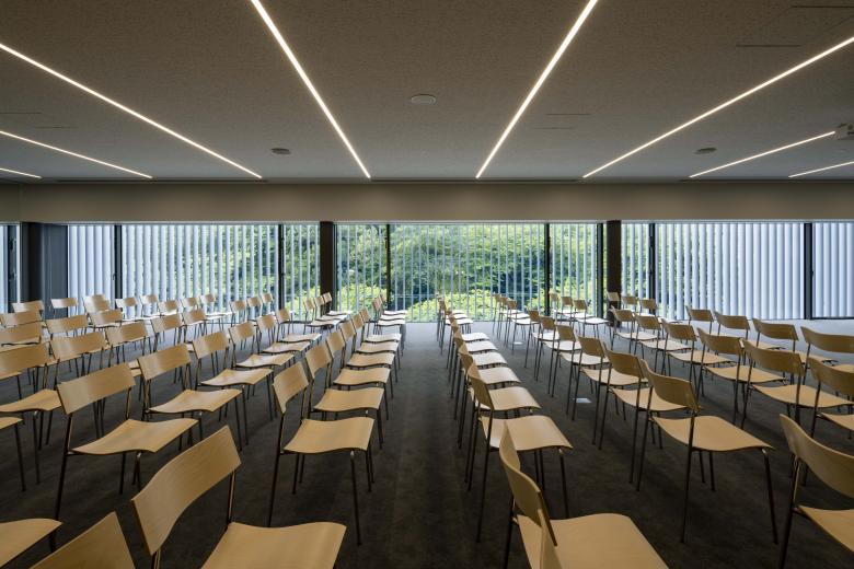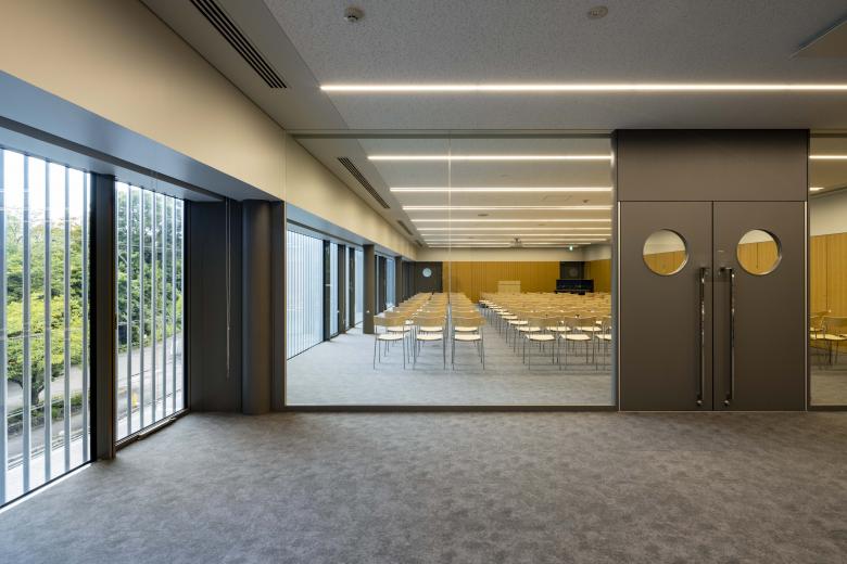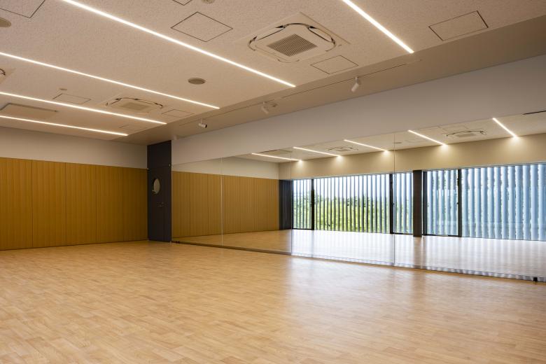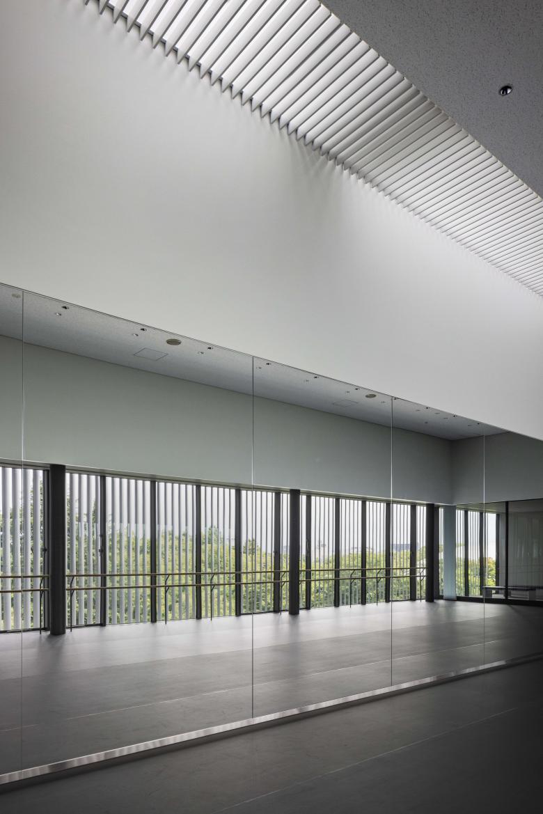The third floor features a hall suitable for seminars and lectures organised by the newspaper company, which can also function as a classroom for the cultural centre. The fourth and fifth floors, offering panoramic views over "Takaoka Kojo Park", house a dance studio, yoga studio, multi-purpose classroom, and reception room. The sixth floor features a ballet studio with distant city views through the treetops of "Takaoka Kojo Park". The first floor contains a soundproofed music studio.