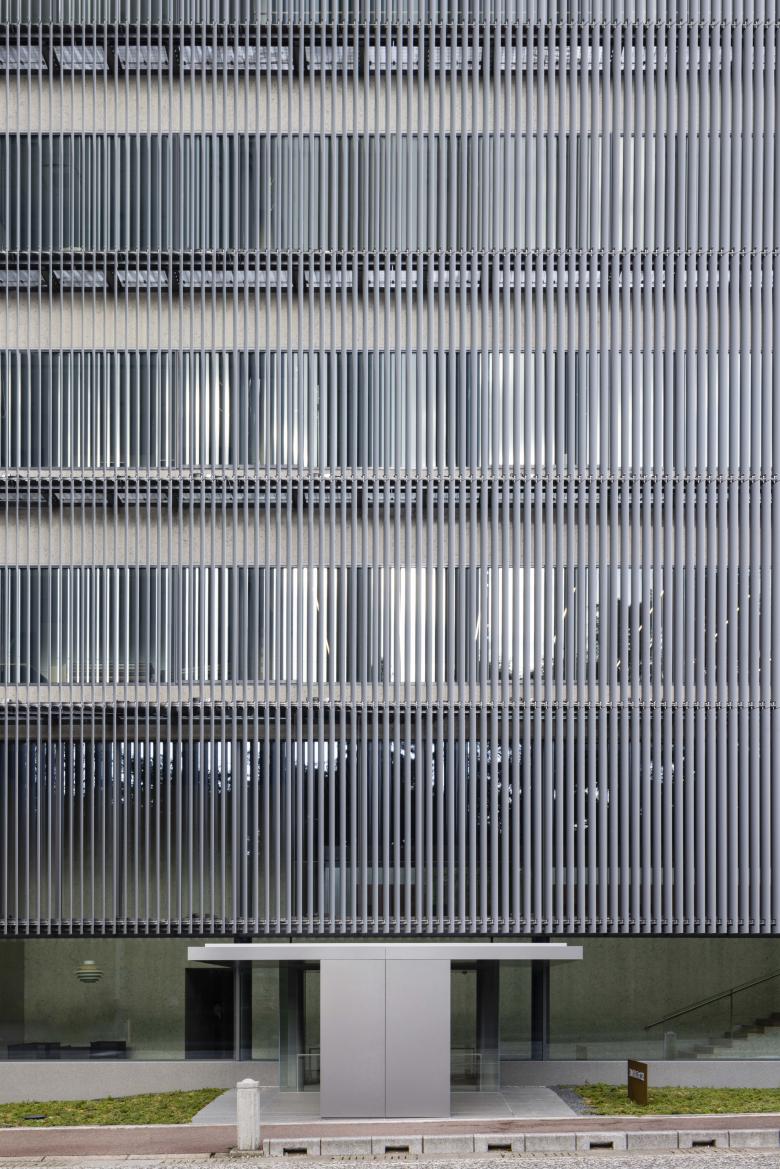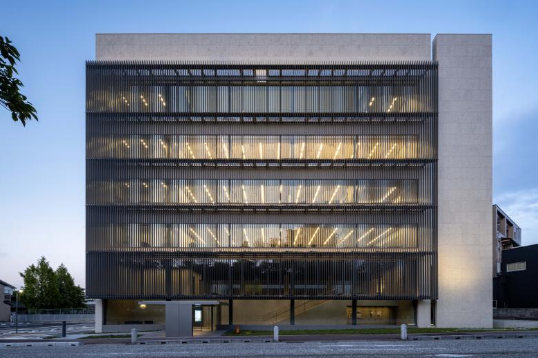 Vertical louvers with a streamlined cross-section, installed on the building's western façade, serve both as an expressive element and as a device to block the intense western sun while introducing soft, indirect light into the interior. The orientation of the louvers is set to change angle in accordance with the sun's movement. At night, the warm light filtering through the lattice gently illuminates the streetscape, creating a subtly changing appearance depending on the time and weather.