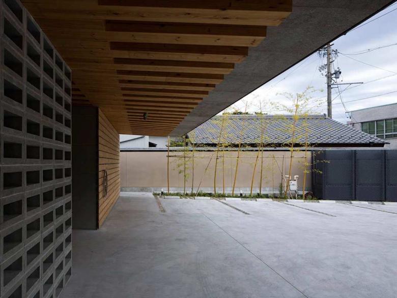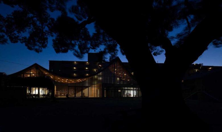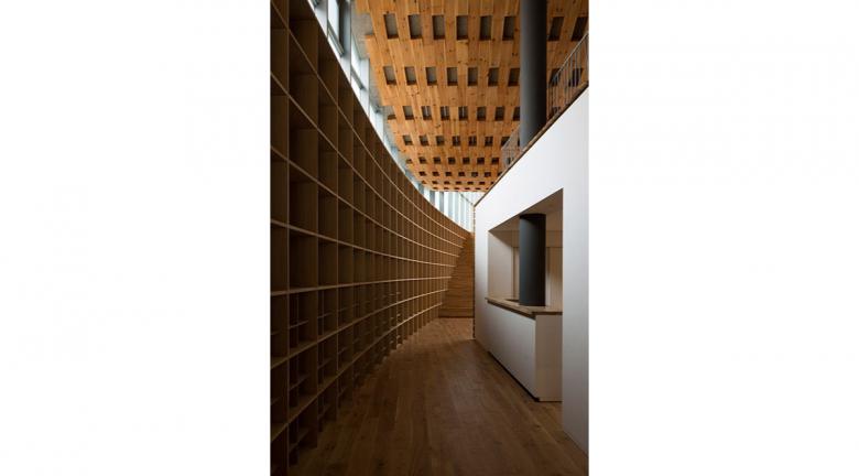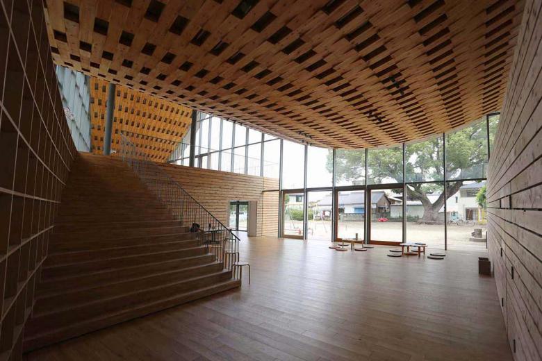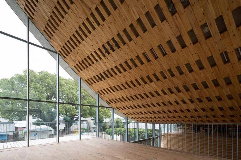 There are many remaining shrines and temples facing to the old Tokaido that create the calm neighborhood nearby. All of their layouts obey the following order: low-eaved gate facing the street, precinct which also works as a public space, and then large-eaved main building in the back. Following this, the gate part that houses a cafe and a staff room was positioned to face the street, then the hall that corresponds to a precinct, extending to the adjacent park (and the landscape of the big tree) and the large space housing classrooms in the back. It is very common that when visiting an old shrine, the line of sight would be smoothly led to sky through a big curved roof of the main temple after walking through the low gate into the precinct. Such experience is also reintroduced by reversing the spatial configuration of the roof to the ceiling warping upward. Moreover, the higher roof of the main volume can be seen beyond the one of low-rafter eave from the old Tokaido: it is the exact appearance of local temples.