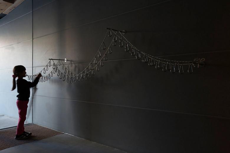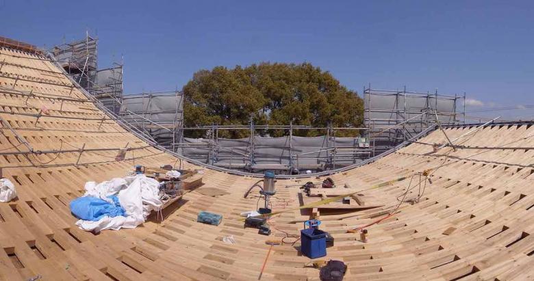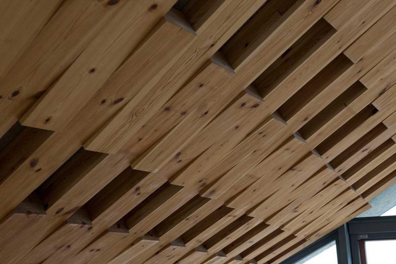 On the other hand, the existence of this architecture is realized by the shape of the catenary curve defined by gravity - the most fundamental element in natural science. The tender roof like a timber cloth, which is supported by two parallel steel Torii-gate-shaped frames, covers the whole space creating architecture for children gently. This timber fabric was weaved with warp of short laminated European Red Pine sticks (Length: 1500mm, Width: 105mm) and woof of two steel rods(φ22mm) perforating them. Only tension occurs within the structure due to the property of the catenary curve, so this gentle and soft wooden roof frame enables to cover a large-span (up to 20m) pillarless space.