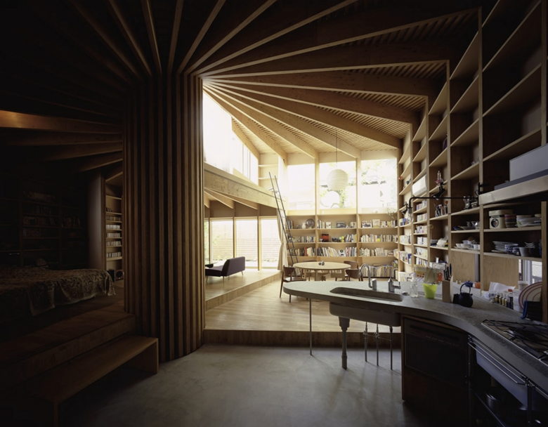 The interior is divided into four territories by this central pillar, in the similar format found in the traditional Japanese houses in square shaped plan divided into four territories _ although the division does not occur in fixed 90 degree because the system is based on the polar coordinate.