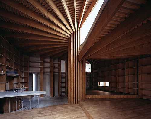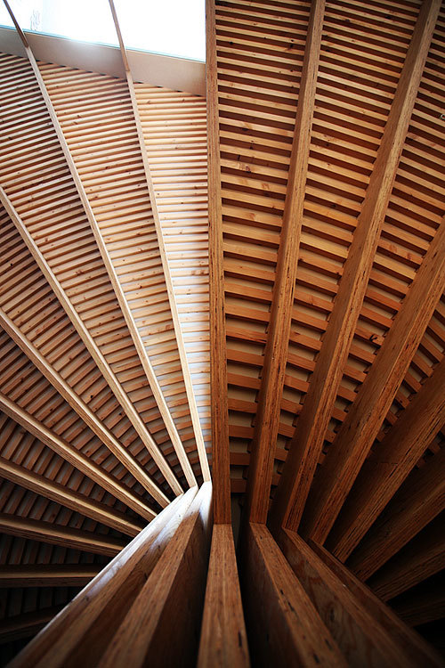 The completed house was formed by the strict rules of the geometry, but somehow it achieved the atmosphere unlike the artificial object. When we sit down at the bottom of the central pillar and lean against to look up, those radially extending beams appear to be the branches of a large tree.