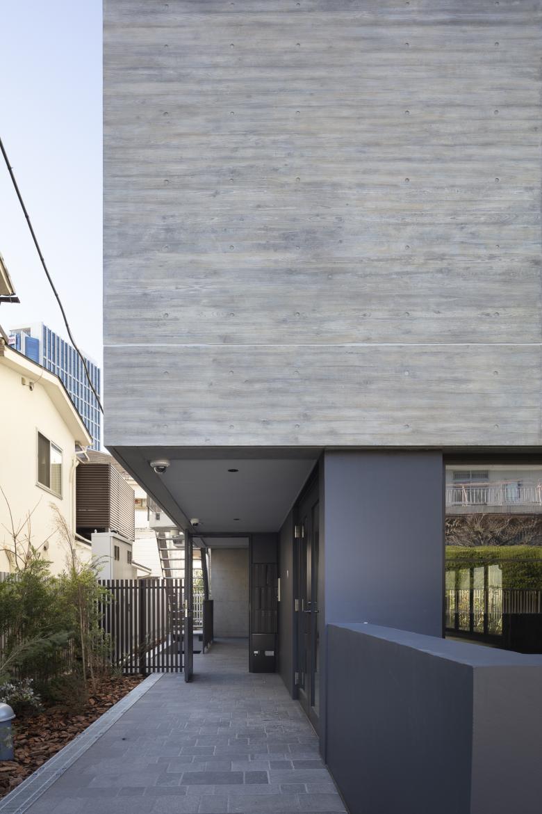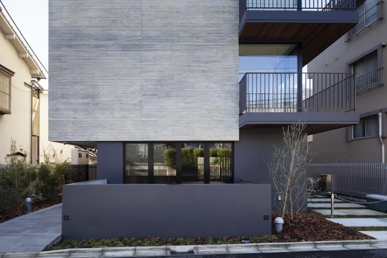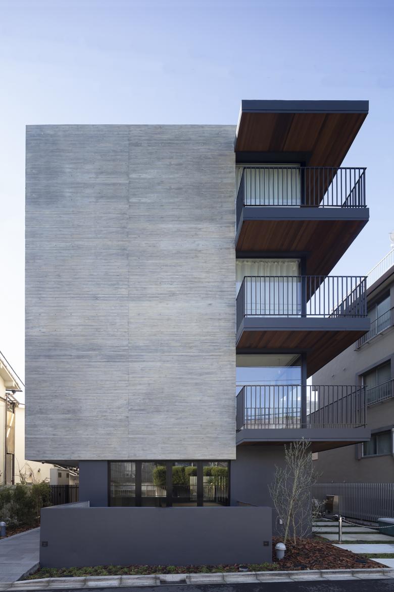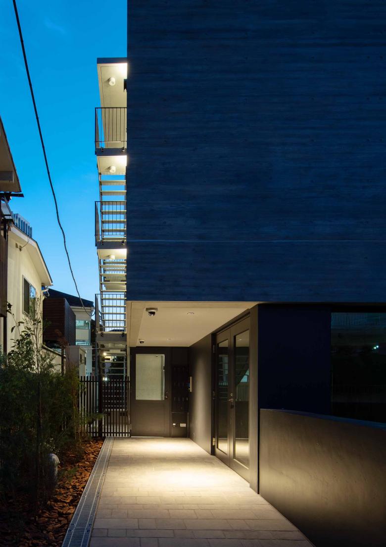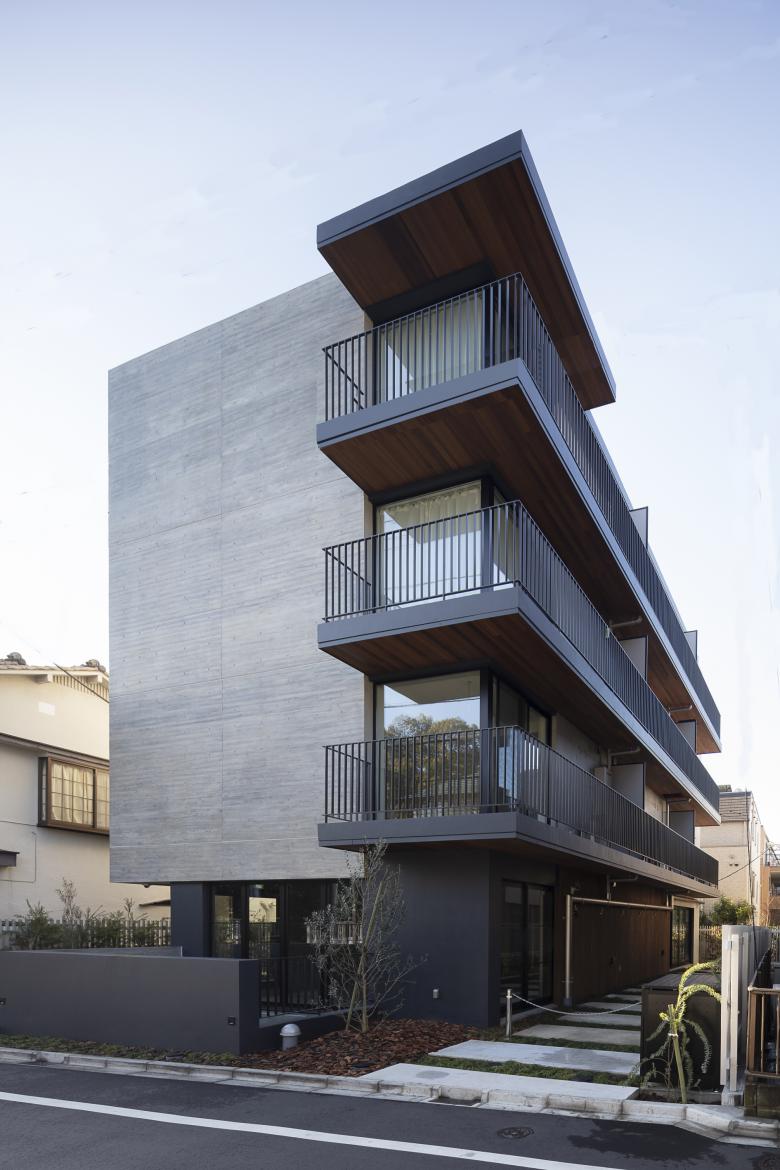 A 7-minute walk from Futakotamagawa Station, the building complex stands in an area where old buildings remain in contrast to the large-scale development in front of the station. The building consists of tenant buildings on the ground and first floors, and rental housing on the second through fourth floors. The exterior was designed to express the image of nature, outdoor life, and family life that Futakotamagawa symbolizes in a low-cost, modern design, using cedar slab concrete, red cedar, and black steel. The balcony is a design feature that creates a sense of connection with nature. Due to landscape and greening regulations, the vacant lot is heavily planted, thereby blending in with the streetscape and landscape. There are many old buildings in the neighborhood, and some of them will be rebuilt in the future. We hope that this building will serve as a benchmark and improve the entire surrounding townscape.