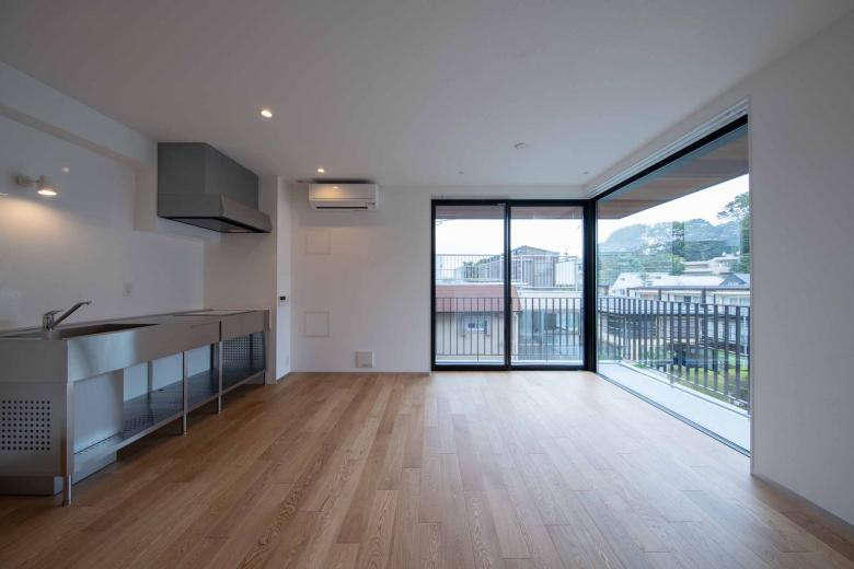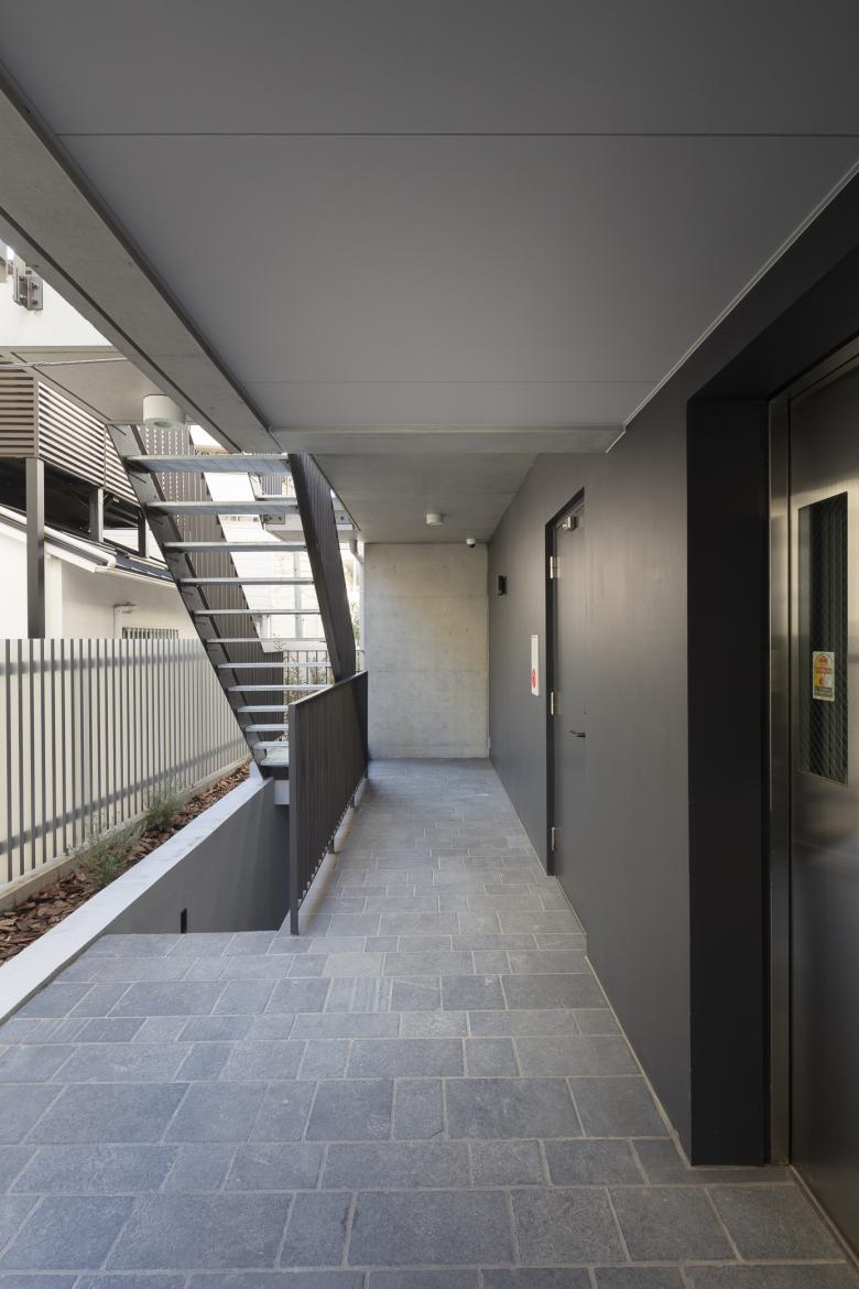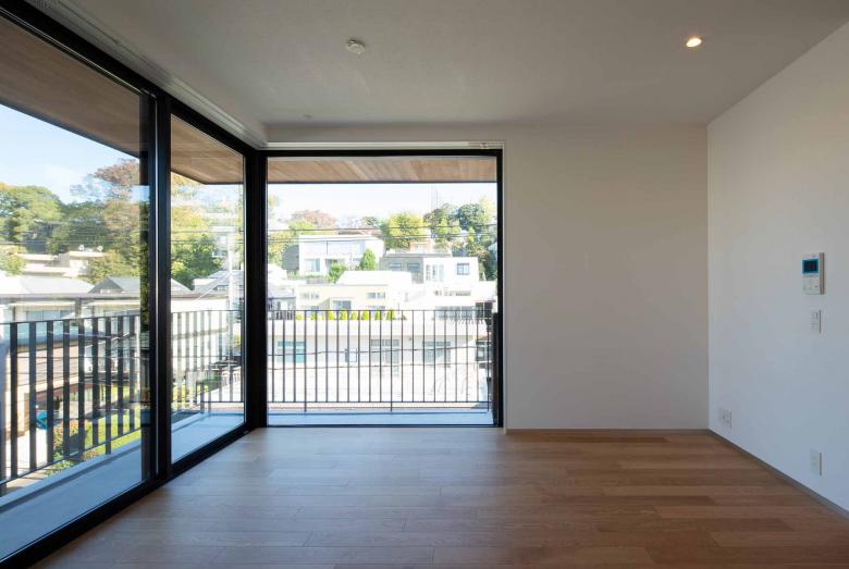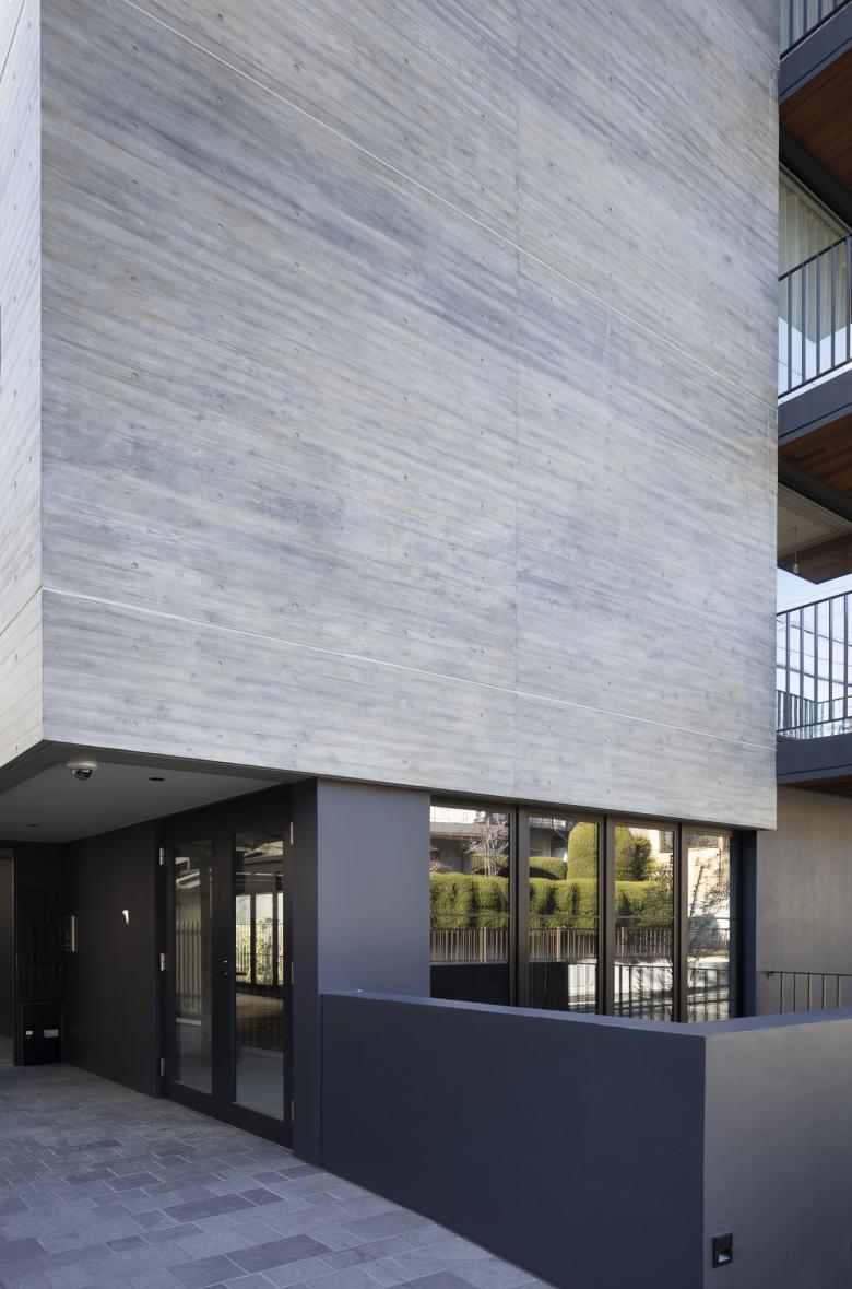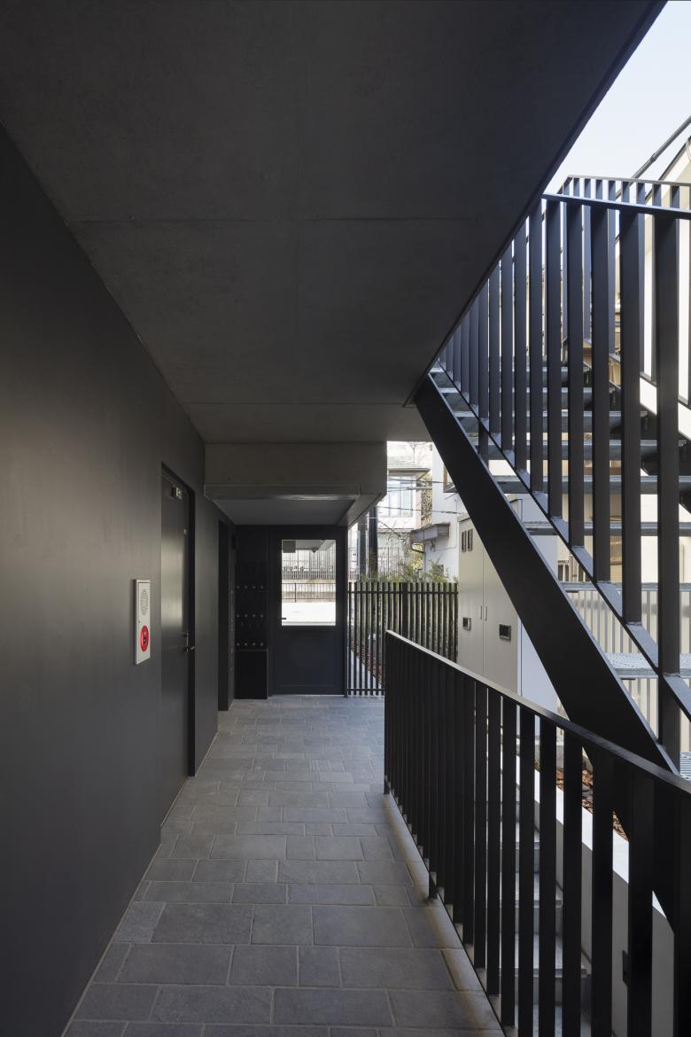 A 7-minute walk from Futakotamagawa Station, the building complex stands in an area where old buildings remain in contrast to the large-scale development in front of the station. The building consists of tenant buildings on the ground and first floors, and rental housing on the second through fourth floors. The exterior was designed to express the image of nature, outdoor life, and family life that Futakotamagawa symbolizes in a low-cost, modern design, using cedar slab concrete, red cedar, and black steel. The balcony is a design feature that creates a sense of connection with nature. Due to landscape and greening regulations, the vacant lot is heavily planted, thereby blending in with the streetscape and landscape. There are many old buildings in the neighborhood, and some of them will be rebuilt in the future. We hope that this building will serve as a benchmark and improve the entire surrounding townscape.