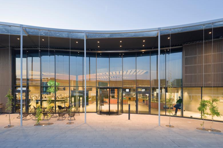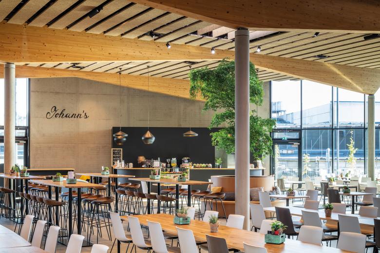 With seating for around 400 people, the restaurant serves around 1,000 meals a day. The successful combination of exposed concrete and wood in the interior of the restaurant offers a high quality of stay. Particularly noteworthy is the fact that the premises can be mechanically ventilated and cooled. The façade of the building is made of wood and the green canopy outside invites you to linger in summer.