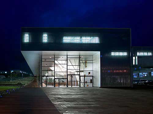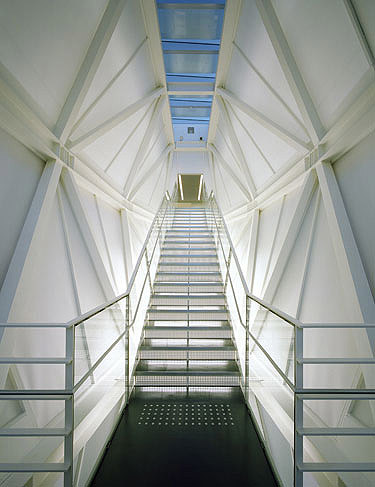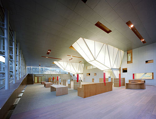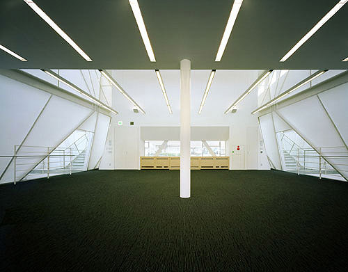 Five large slits pass from north to south through the building, providing for circulation and light penetration. The upper portion of each of these slits, with the exception of the main entrance, is enclosed by a shape inspired by the body of a crane, clad in translucent white panels through which natural light filters into the building. Structurally, the cranes carry the majority of the building's horizontal loads, allowing the south facade of the building to remain open and clear and introducing natural light and ventilation. Staircases running through the five slits provide flexible entry from north side parking, and solar panels placed above act as stationary louvers and help to offset the center is energy consumption.