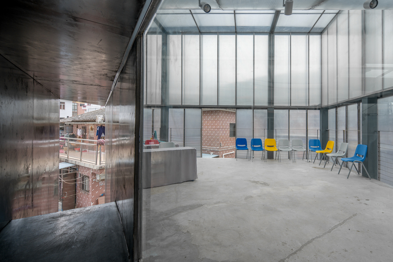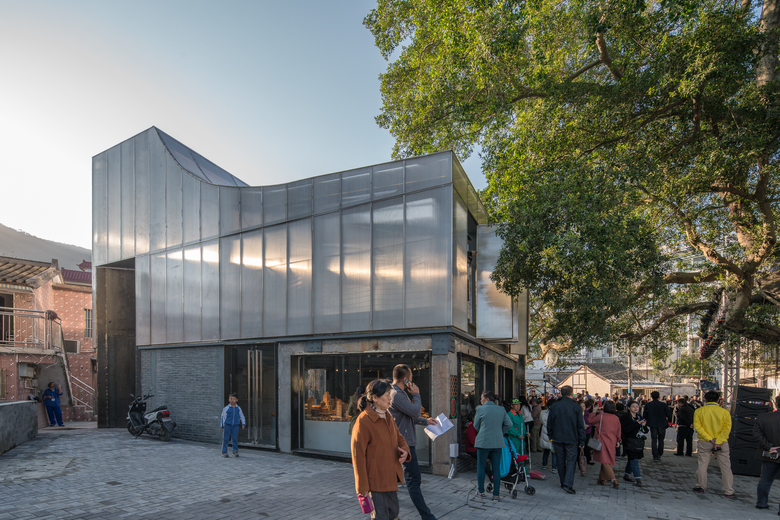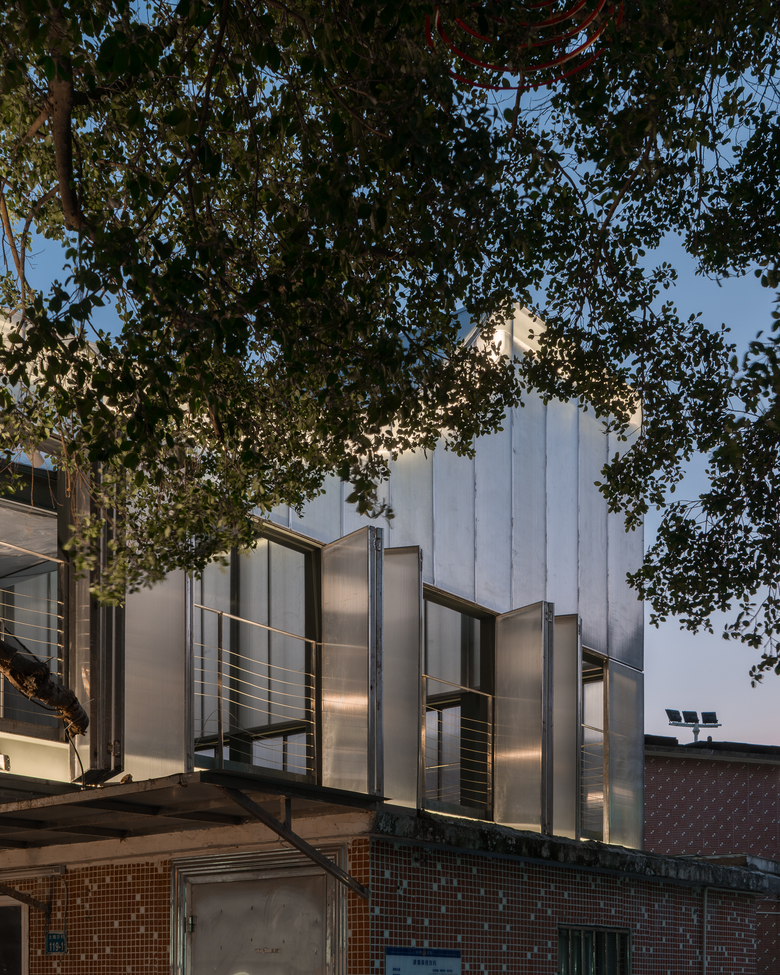 House 10, originally a frame-structure single-floor building, is renovated based on the existing conditions and topography as well as the design concept of interconnection, integration and transparency. "interconnection" -- with diagonal stairways embedded into existing building, alleys and Banyan Square are interconnected, continuing the typical feature of alleys in urban village to be accessible from all directions. "Integration" -- the original frame structure on F1 is retained as the basic building structure, from which a new F2 is added. The curved roof and skylight echo with the banyan at the shrine from a distance, reinforcing the sense of place. "Transparency" -- transparent sunlight panels reduce the massiveness of the building, while the interior and exterior building spaces mutually penetrate into each other. The light and transparent facade of the added F2 and roof constitute a sharp contrast with the massiveness of the original concrete structure.