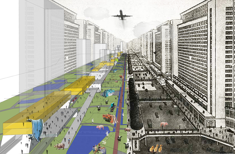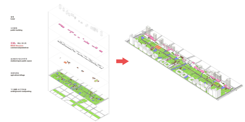 The design proposal aims to provide possibilities and methodologies of alternative planning and architectural design for the public supporting facilities and public green land of the new town. There were once ideas of the urban parlor and urban furniture. However, the urban parlor is a formal and static communication space, whereas the kitchen could bring alternative life experience to people. Kitchen represents a production space where the raw food is cooked and the creative idea is realized from scratch; it is also an informal communication space where working people interact, help each other and entertain themselves. Rem Koolhaas once mentioned “Culture of Congestion,” while we now further this idea to “Culture of Constant Congestion”. By means of the kitchen concept, a gigantic soft and hard infrastructure comes into being as a modern prototype that differ itself from the conventional and singular planning approach of the new town. This gigantic structure accommodates both the orthodox and unorthodox properties of temporization and subversion.