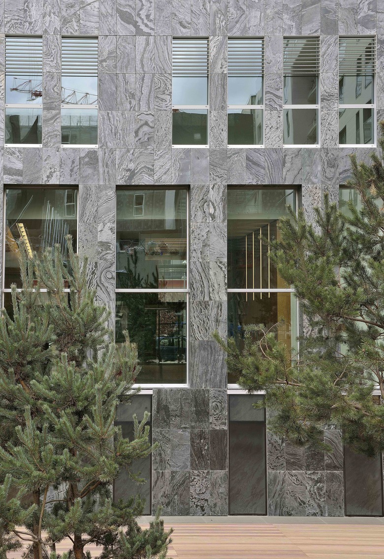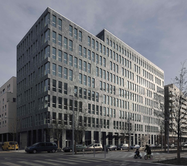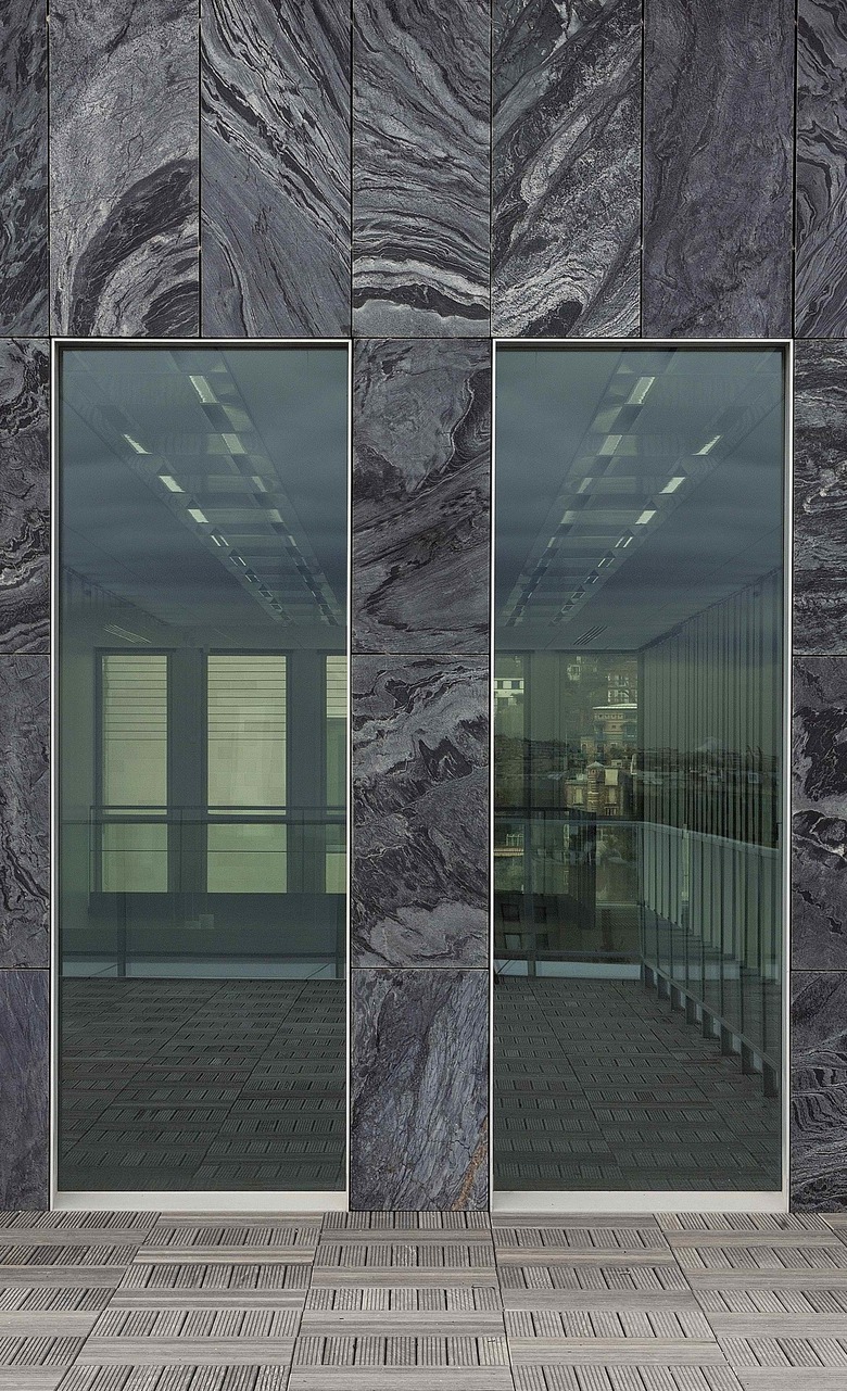 Following the calling of the competition, the extent of the constraints imposed by the planning regulations and the agents intervening in the process is interpreted through a sober, simple building. A product of the central communications core, the open floor plan conveys the structure to the facade, which is covered with silvery phylite stone and windows and frames of anodized aluminum. The rock-like complex is cut back in a cantilever on the ground floor and in the cutback of the attic on the opposite side, thus facilitating access to the inner courtyard.