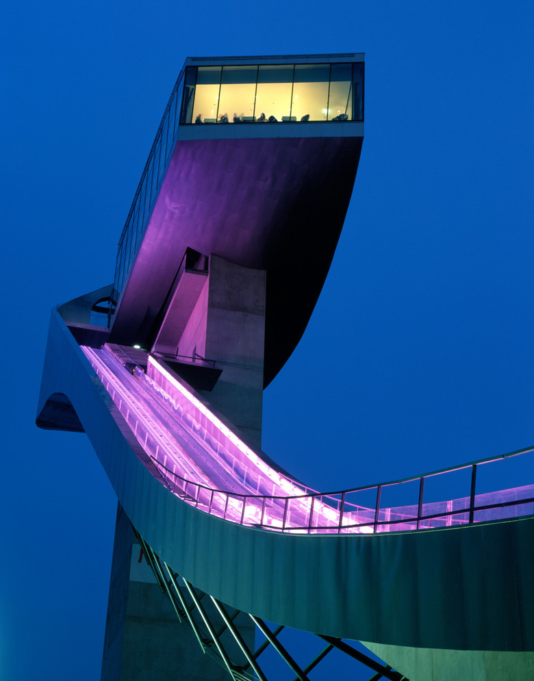 The dramatic nighttime lighting of the Bergisel Olympic ski jump makes it stand out against its alpine backdrop. The 360-degree windows of the restaurant form a luminous slice in the solid structure, revealing silhouettes of activity within. A glow of color-changing light radiates from the jumper’s starting point, highlighting the structure’s sports function.