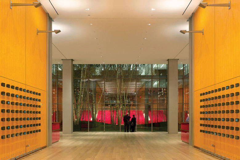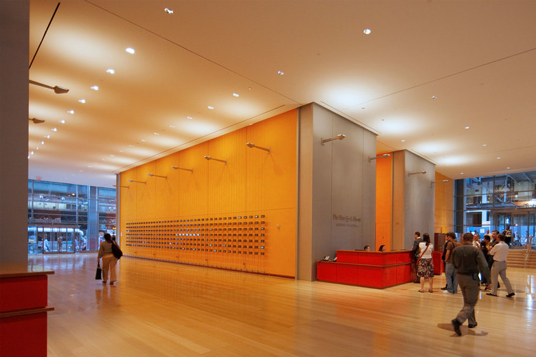 Nighttime lighting reinforces the New York Times Building’s elegance through a precise gradation of light: brightest at the base of the tower and tapering to a soft glow at its summit. Luminaires equipped with state-of-the-art optics were used to stretch illumination across the entire 850’ tall facade. To meet Times Square District requirements for providing an animated façade, select luminaires above pedestrian level are painted “taxi-yellow”—a cultural reference to midtown traffic. Together with the logo graphic, this solution circumvents the usual illuminated billboards and large video screens. In the lobby, lighting highlights the building’s integrated exterior and interior architecture. By controlling illumination levels through the depth of the space, the scheme draws one’s gaze through the interior garden courtyard and into the glass-walled Times Center auditorium space beyond.