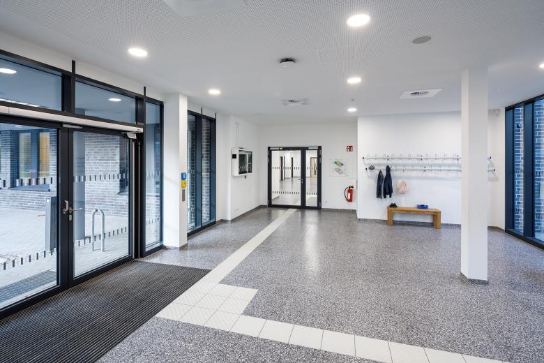 In Hamminkeln am Niederrhein ist ein Ersatzneubau für die Grundschule Mehrhoog am Standort der Offenen Ganztagsschule entstanden. Mit dem Neubau wurde die Schule auf drei Züge vergrößert. Der Neubau wurde mit dem Raumkonzept der Cluster-Schule geplant und umgesetzt. Die Lern- und Aufenthaltsbereiche in den jeweiligen Clustern bieten den Lehrern und den Schülern zusätzliche, individuell nutzbare Flächen. Insgesamt befinden sich auf rund 3.700 Quadratmetern zwölf neue Klassenräume sowie vier Fachräume im Gebäude. Der Ersatzneubau besteht aus einem zweigeschossigen Hauptgebäude mit Schule und Verwaltung sowie einem verglasten Verbindungstrakt zwischen Neu- und Bestandsbau, der gleichzeitig als Haupteingang fungiert. Das Obergeschoss des neuen Gebäudes ragt zum Teil in den Schulhof hinein und bietet so einen überdachten Bereich, der in der Pause Schutz vor schlechtem Wetter bietet. Die Fassade wirkt freundlich und einladend: im Erdgeschoss mit zweifarbigen Klinkerriemchen, als Verbindung zwischen Bestand und Neubau, im Obergeschoss mit einer Holzlamellenbekleidung. Die Fenster und Fenstertüren sind aus wetterresistentem Aluminium. In Kombination mit der „naturbelassenen“ Holzlamellenbekleidung entsteht ein harmonischer und moderner Gesamteindruck.