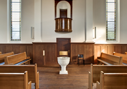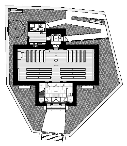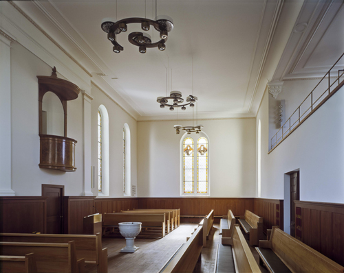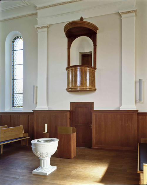 Der wichtigste architektonische Eingriff war die Rekonstruktion der Eingangshalle mit dem mittigen Eingang. Damit ist die ursprüngliche Sequenz des Eintretens wieder erlebbar: Vom Dorfplatz erreicht man über fünf Stufen den Kirchhof. Über weitere fünf Stufen gelangt man in die Vorhalle. Auf der Mittelachse geht man direkt in die Querkirche (Eingang-Taufstein-Kanzel). An der Stelle des Haupteingangs konnten wieder die alten Türen eingesetzt werden, die 33 Jahre im Estrich eingelagert waren.