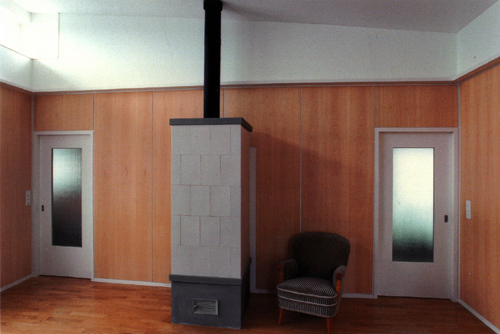 Damit die Holzkonstruktion auch “sichtbar” wird, wurde das Haus: aussen mit weiss lasierten, innen mit grossflächigen Ahorn- Sperrholzplatten verschalt.