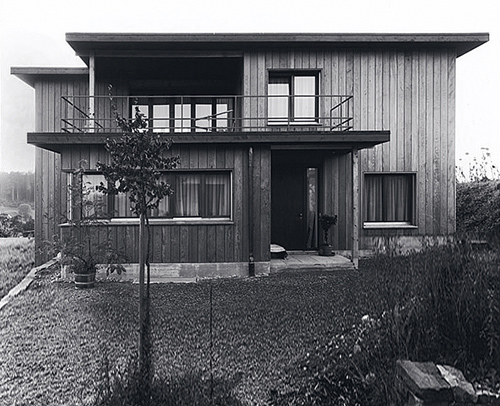 vertikalen Schalung aus unbehandelter Douglasie verkleidet. Im Erdgeschoss wurde der Holzkonstruktion eine Wand aus ungebrannten Lehmsteinen vorgemauert. Darauf kam ein Sumpfkalkmörtel als Verputz, der "al fresco" gestrichen wurde. Diese Lehmwand gibt dem Holzhaus "Masse", die für ein ausgeglichenes Raumklima im Winter erforderlich ist. Die Schreinerarbeiten wurden durchwegs mit massiven Brettern und Tischlerplatten ausgeführt.