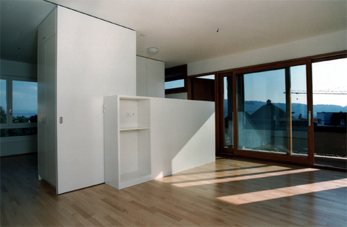 Im zweiten Wohngeschoss wurden jeweils zwei Wohnungen zu einer grösseren 2-Zimmer-Wohnung zusammengelegt.Mit einem grösseren Fenster auf dem Laubengang wurde neu auch eine Orientierung hin zur Stadt ermöglicht. Im dritten Wohngeschoss, einer neuen Aufstockung, wurde ein Einraum-Konzept realisiert, bei dem die Nutzungen in Nischen liegen, die durch ein in der Mitte stehendes Möbel generiert werden.