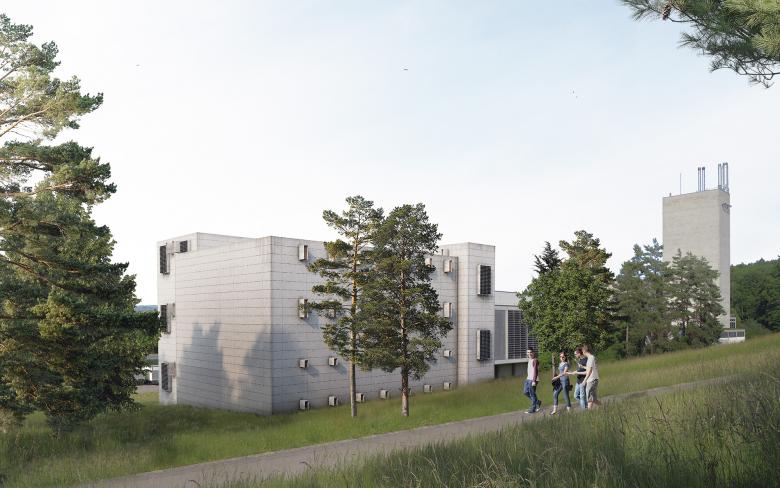 Für das HRZ werden vier einfache programmatische Gebäudetrakte vorgeschlagen, die windmühlenartig mittels zwei kreuzförmig angeordneten Betonwänden gebildet werden. Vertikale und horizontale Erschliessungsbereiche, sowie Server- und Kühlräume werden gleichzeitig funktional und skulptural miteinander verschränkt.