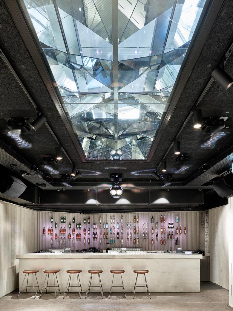 Das Restaurant besteht aus einem ca. 300m2 grossen Gastraum, der sich U-förmig um den innenliegenden Erschliessungskern legt. Betonoberflächen an Boden und Wänden sowie rohes Mauerwerk verleihen einen rauhen Gesamteindruck. Textilien verleihen dem Raum eine weiche, sinnliche Atmosphäre. Zinn, Beton, Samt, Velours bilden Kontraste im Innenausbau. Ein Oberlicht mit fragmentierten Spiegeln und Halbspiegeln verbindet das Restaurant im EG optisch mit dem Clubraum im 1.UG. Im hinteren Raumteil befinden sich zwei lange Beton-Zinntheken, die im Tagesbetrieb als Verkaufstresen und im Nachbetrieb als Bars genutzt werden.