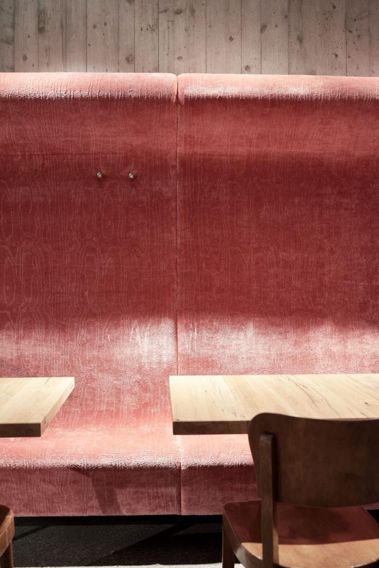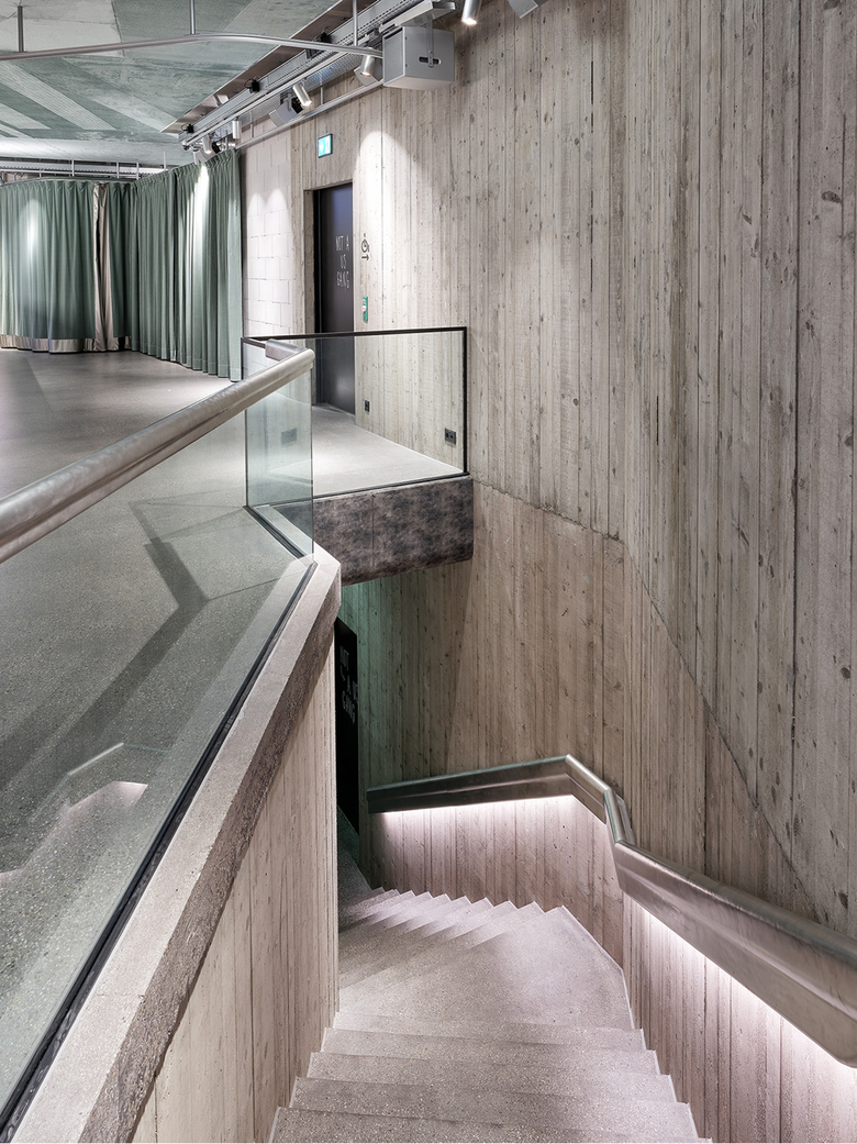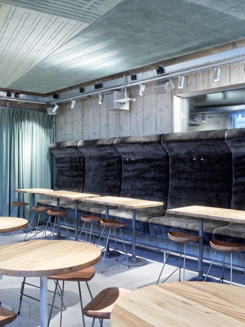 Durch die Fensterfronten an der Langstrasse, der Brauerstrasse und von der Hofseite gelangt Licht in den erdgeschossigen Innenraum und aktiviert je nach Tageszeit das monochrome Deckenkunstwerk aus Veloursteppich des Künstlers Tobias Hantmann. Die Teppichfasern des Deckenbilds transportieren, absorbieren und reflektieren das einfallende Licht sehr unterschiedlich. Es werden damit Farbtöne von silbergrau bis tiefgrün erzeugt, die mit Kunstlicht verstärkt werden können. Grosse, samtbespannte Biegesperrholzobjekte an den Wänden fungieren als sowohl als Sitzmöbel und als auch als weiche Akustikabsorber.