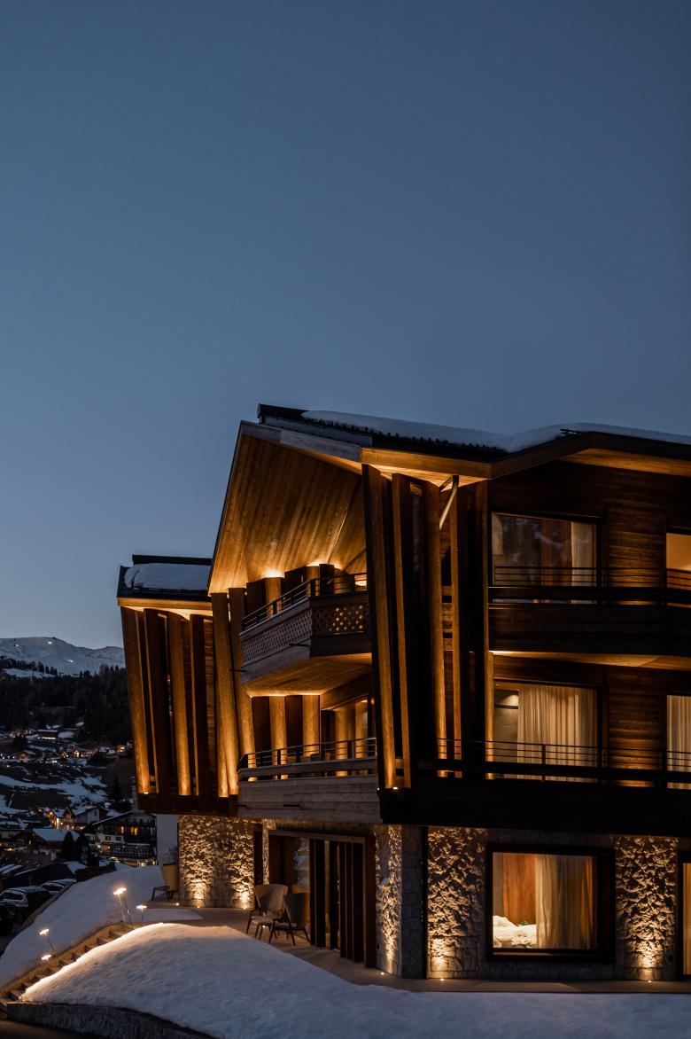 The two upper floors are clad in dark wood, while the ground floor, faced with local stone, serves as a solid base and gives the building a strong material presence. Large windows and glass doors lead to terraces and balconies, extending the interior living spaces outward and offering exceptional views of the surrounding landscape.