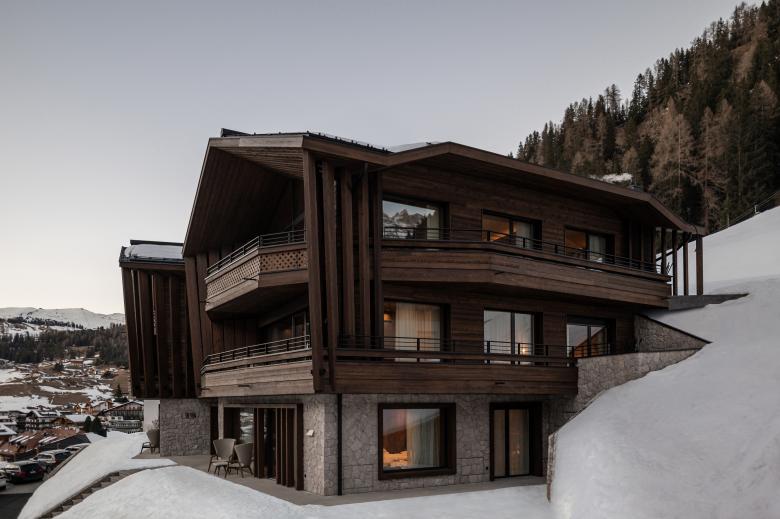 This chalet in Selva di Val Gardena blends harmoniously into its natural surroundings, characterized by the enchanting Alpine landscape and the traditional architecture of the Dolomites. The project originates from the combination of two houses that merge into a single volume, articulated over three above-ground floors and carefully integrated into the existing slope.