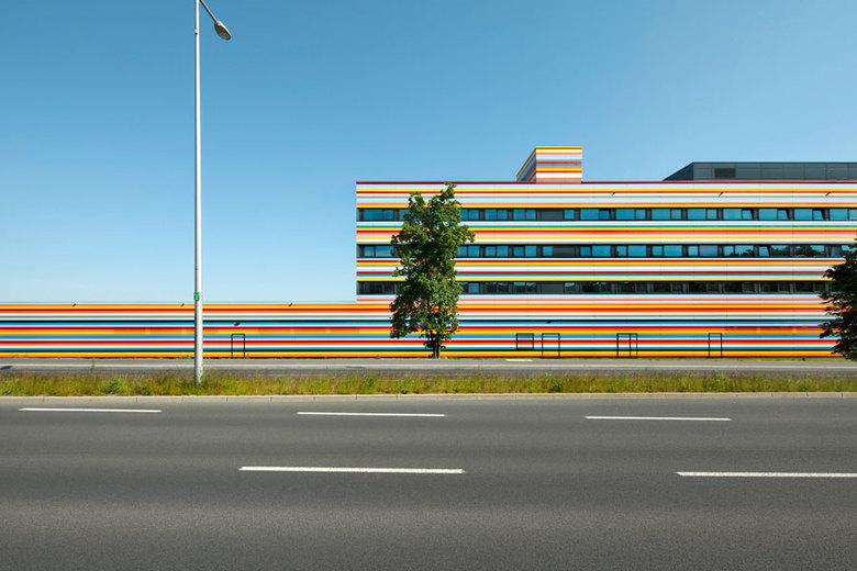 What we see is not the envelope as a facade of a house, but the "image" of a facade - an abstract composition that defies a clear organizations (building + use) and instead intrigues the passersby and invites them to create their own abstraction. The color selection offered by the manufacturer did not seem sufficient to achieve this goal. Therefore, additional colors that we derived from our coding were required. The texture of the colored coating ("dim") makes the façade a self-cleaning surface, it is UV-stable, non-glare, the colors are intense in all weather conditions, and particularly emphasizes on the level of abstraction the facade. The collaboration with Thyssen-Krupp was straightforward at all times. They were supportive and interested - even at a time when the system and the costs were not yet calculable.