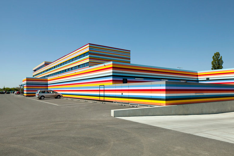 Now facade types were explored - monolithic, unitized, collage (glass + concrete) structures, colors, reflective, etc. A decision was made in favor of a horizontal disposition, which are synchronized which the bands of windows. Planning process required a flexible facade concept – it would be a way to unify the actual appearance of the building previously described as basic geometries: a jumpsuit made ​​of steel panels with defined, summarizing color code. The system is modular and adaptable in the design + construction and the color creates unifies the whole building, it is robust, reversible and affordable.
