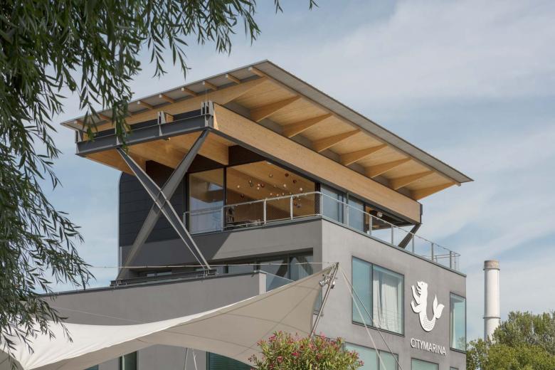 Die Bestandskonstruktion der Decke über OG2 wurde als „Dach“ bemessen und ausgeführt. Die Tragfähigkeit der Konstruktion ist für die zukünftige Nutzung mit Verkehrslasten nicht ausreichend. Aus diesem Grund wird die Konstruktion verstärkt. Stahlträger und vorgespannte StBn-Deckenelemente gemäß statischem Nachweis bilden die neue Deckenebene. Die Dachkonstruktion des zusätzlichen Geschosses wird als Mischkonstruktion aus Holz (Furnier-Schichtholz) in Längsrichtung und Stahl (HEB) in Querrichtung gem. stat. Nachweis errichtet. Stützen werden als X-/ V-Elemente auf den bestehenden Tragachsen positioniert.