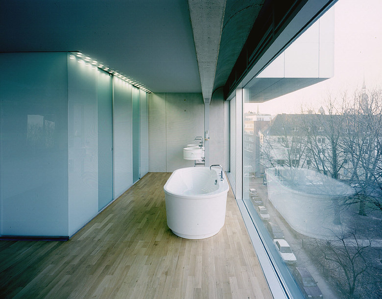 The view relationship to the surrounding is focused by translucent parts of the facade - park and trees become room-high pictures in the room (free from facade profiles, safety rails, ventilator or heating element). The view remains pure.