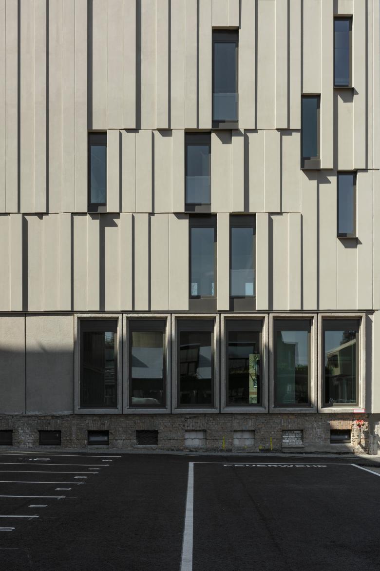 Die Außenwände der neuen Aufbauten entstehen aus Porenbeton-Fassadenplatten, vertikal verlegt in unterschiedlichen Breiten und Dicken, mit innenliegenden Mineraldämmplatten. Die Fassadenplatten werden außen farbig beschichtet. Einige Stellen werden freigehalten und mit raumhohen Fenstern (Festverglasung und Öffnungsflügel) oder Lamellenfenstern gefüllt.