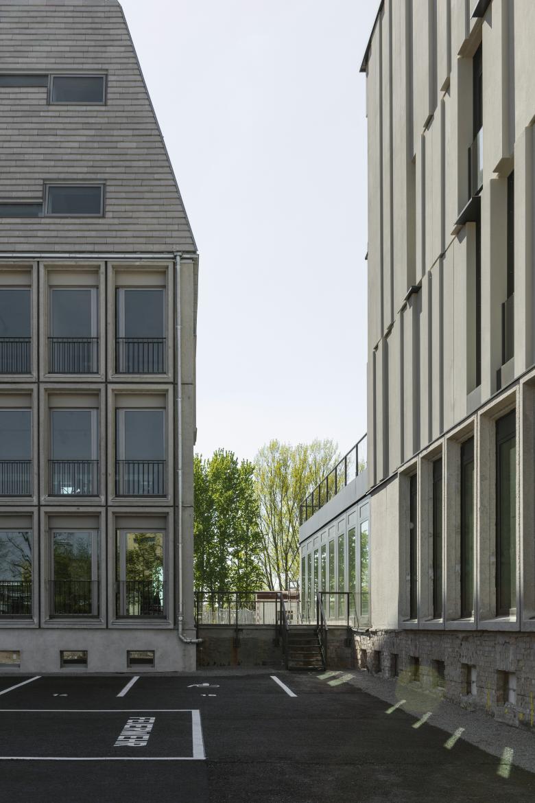 Die Fassade der Aufstockung bildet zugleich einen erheblichen Teil der Dachfläche. Sie erhält eine Schindeldeckung mit Zahnrosten und Lamellenfenstern. Die oberen Einheiten in den Dachgeschossen erhalten vier zugeordnete Dachterrassen.