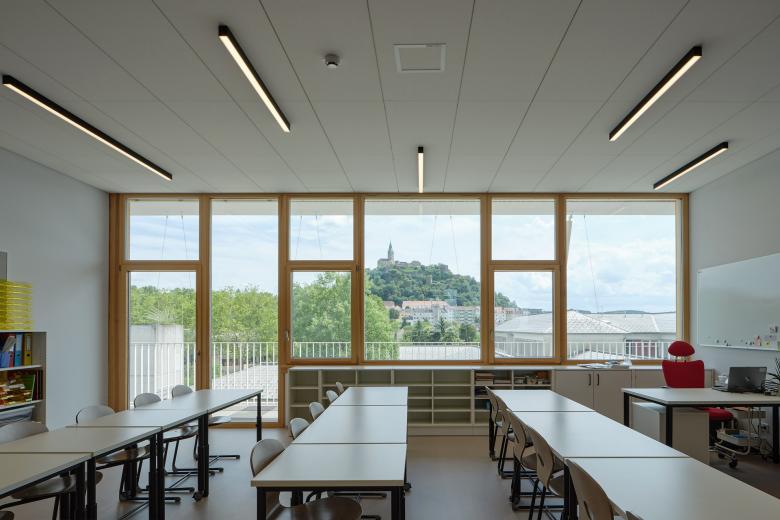 The building is rationally conceived, not only in terms of organisation but also with regard to the construction and building method. The main loadbearing elements follow the classroom grid through all levels, in this way achieving an efficient layout of piers, walls slabs and floor slabs. To achieve the requisite storage mass a massive construction method is used for the building, with wood being used for the secondary building parts and for surfaces to achieve tactile and atmospheric spatial qualities.