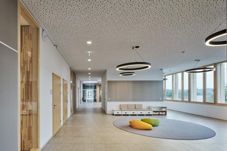 Access to the ASO with its own draught lobby is along the circulation “street” and – in accordance with the requirements of the educational concept – is moved away from the main VS/ZMS entrance, so as not to distract the children excessively. Nevertheless, after entering the building you can take a direct and short route to the central Aula (assembly hall).
